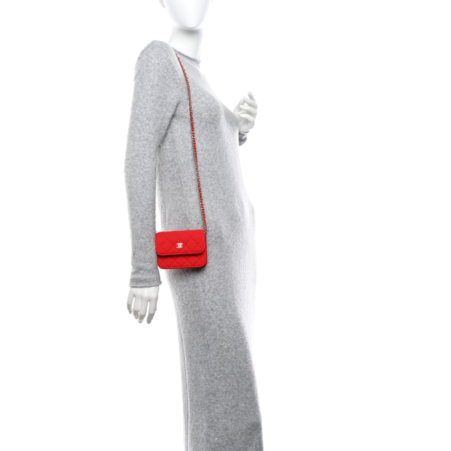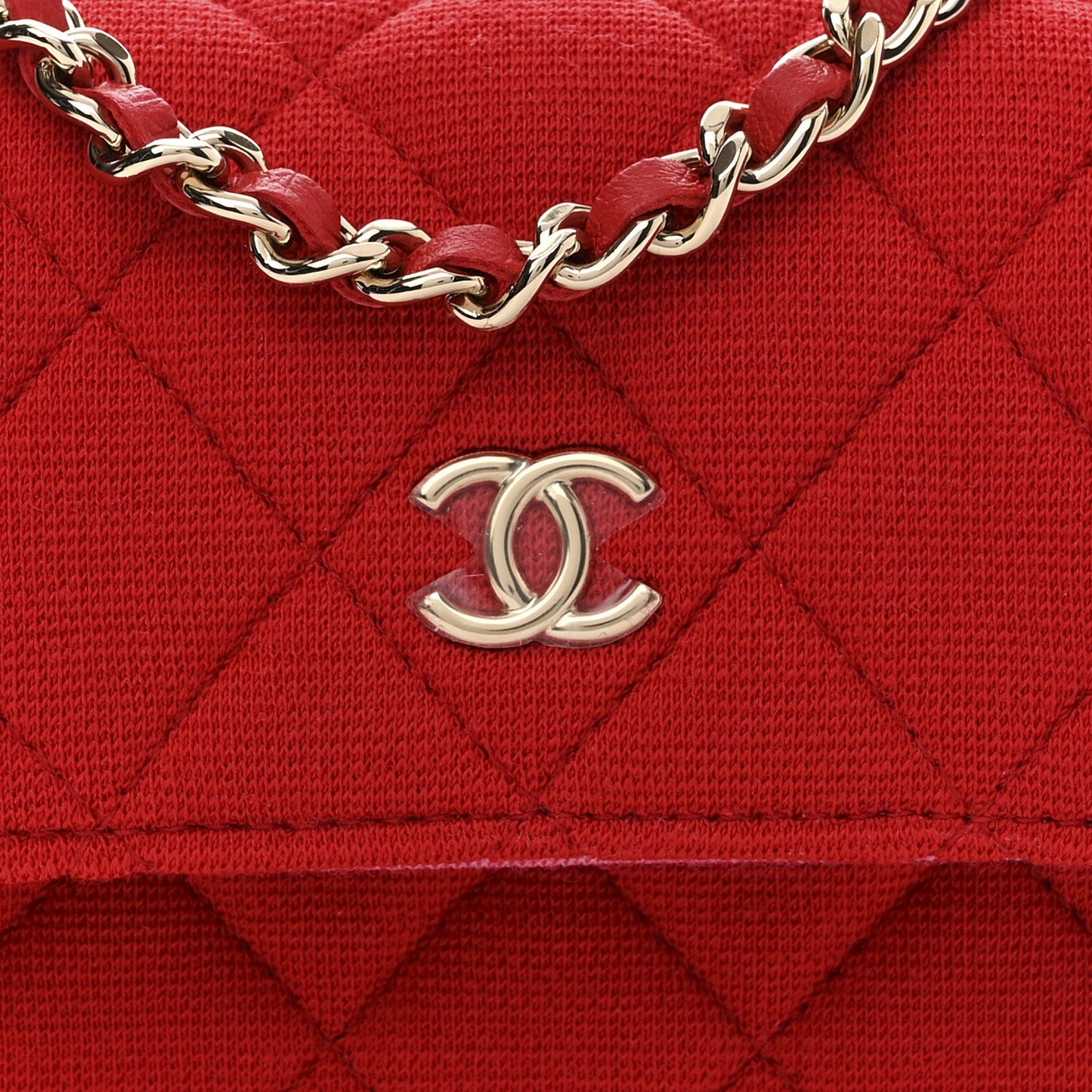 This is an authentic CHANEL Jersey Quilted Micro Mini Flap in Red. This elegant shoulder bag is crafted of luxurious diamond stitched jersey fabric in bright red. The bag features a long gold chain link adjustable shoulder straps threaded with red leather and a light gold Chanel CC logo for the frontal half flap. The flap opens to a pink jersey interior.Follow this item for alerts. Chanel is a registered trademark of Chanel. FASHIONPHILE is not affiliated with Chanel.