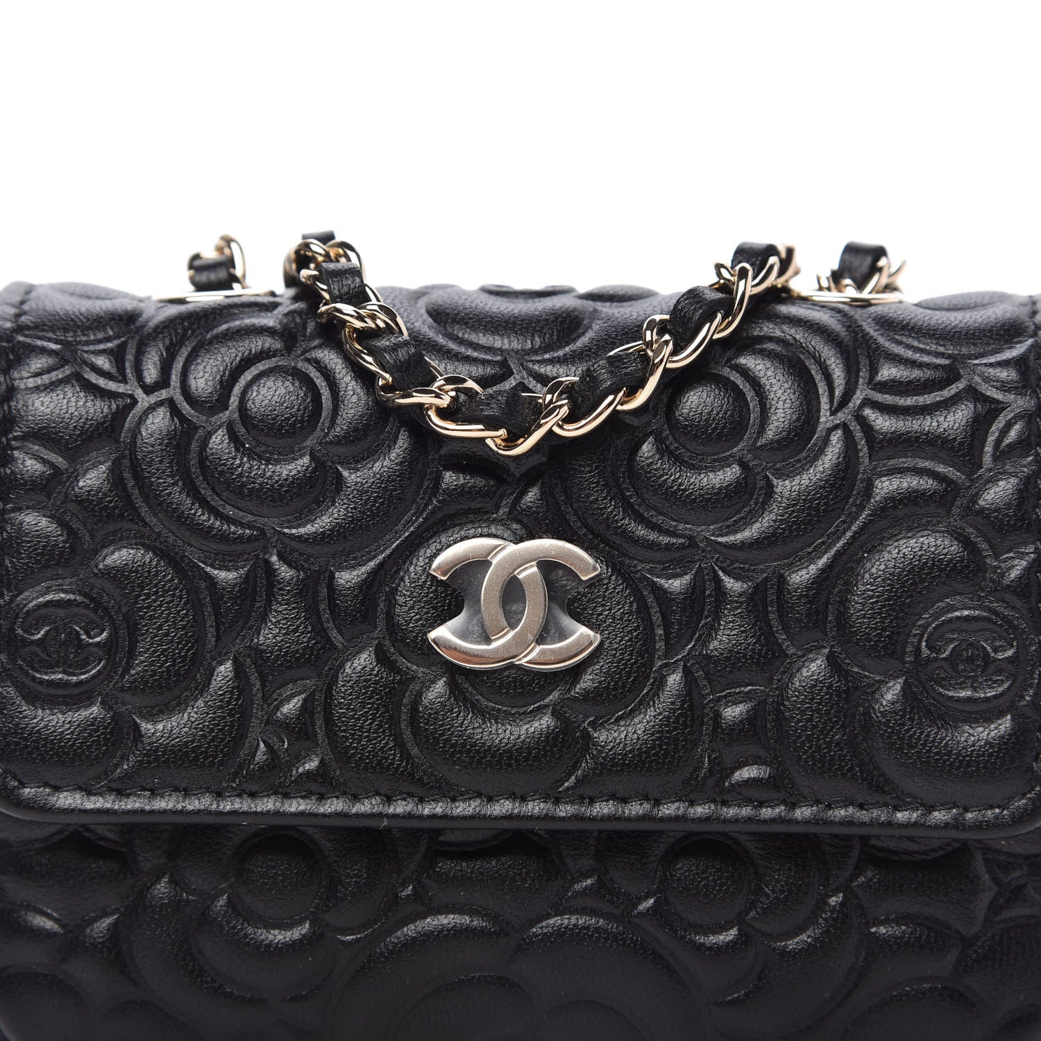 This is an authentic CHANEL Lambskin Camellia Embossed Chain Belt Bag Black. This stylish bag is finely crafted camellia embossed caviar leather in black. The wallet features a polished gold chain link strap threaded with leather and a frontal CC logo with a camellia flower. The flap opens with a snap to a black interior. This cross body wallet is ideal for just the essentials, from Chanel!Follow this item for alerts. Chanel is a registered trademark of Chanel. FASHIONPHILE is not affiliated with Chanel.
