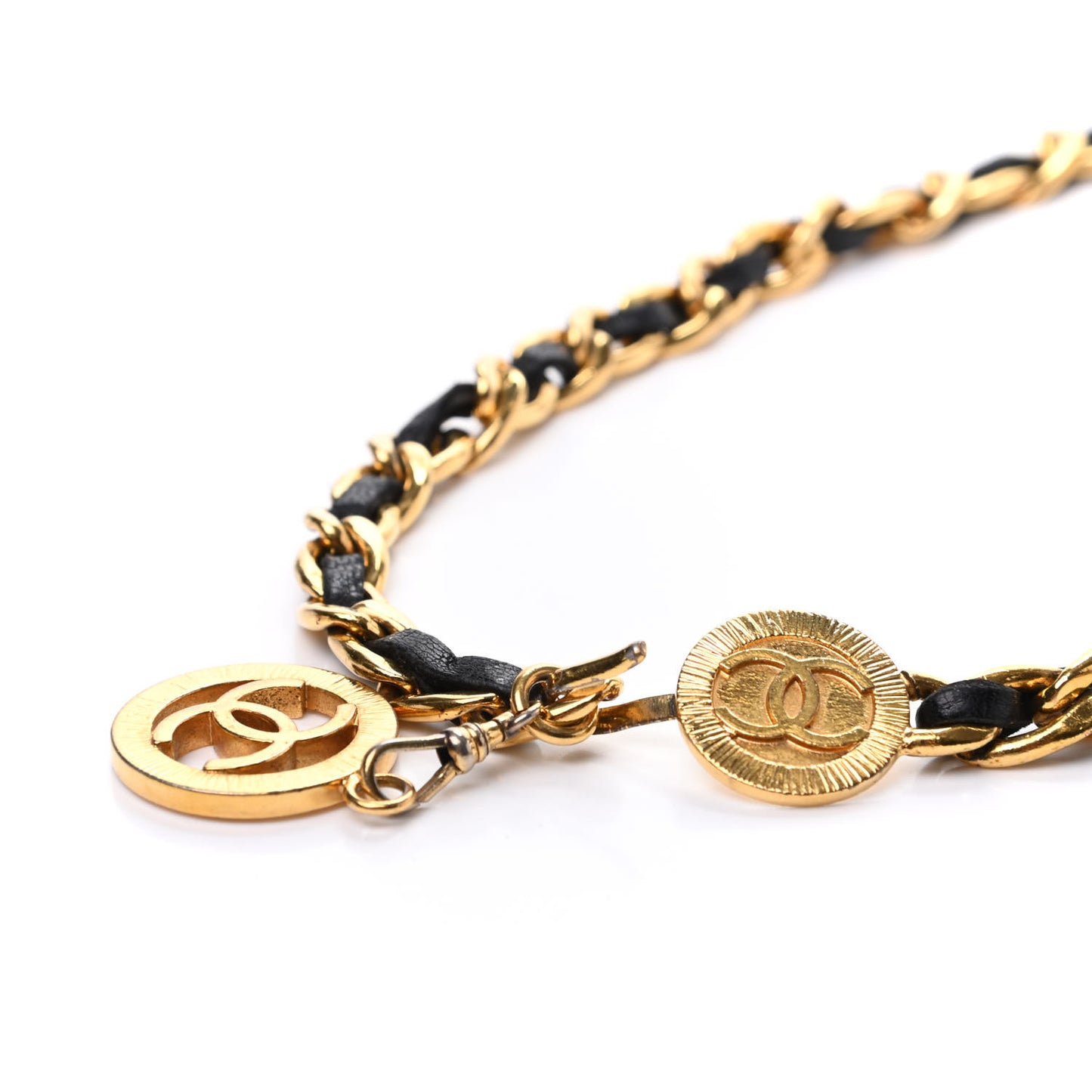 This is an authentic CHANEL Lambskin Chain CC Medallion Belt in Black and Gold. This stylish belt is composed of gold chain links threaded with black leather and features a gold-tone Chanel CC medallion.Follow this item for alerts. Chanel is a registered trademark of Chanel. FASHIONPHILE is not affiliated with Chanel.