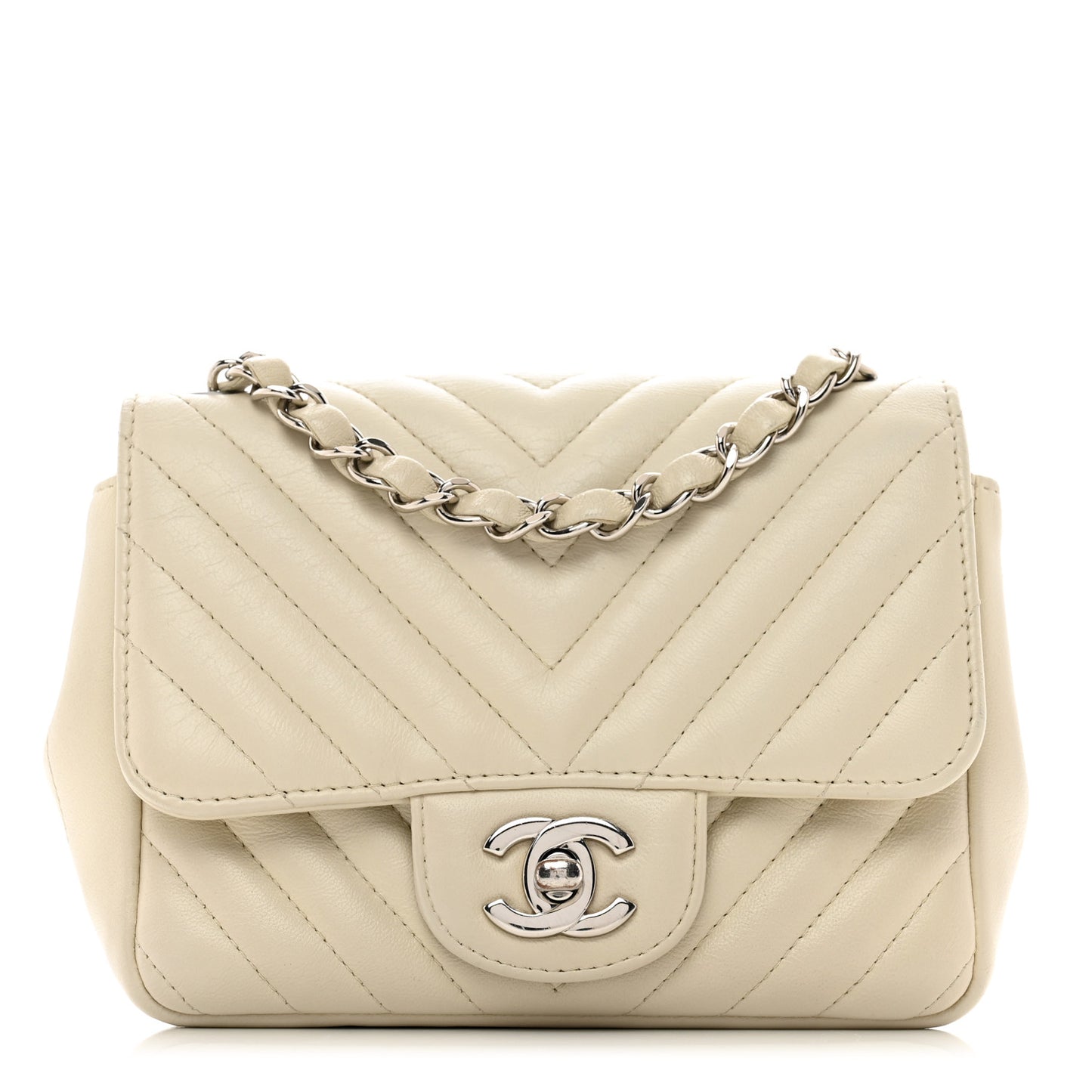 This is an authentic CHANEL Lambskin Chevron Quilted Mini Square Flap in White. The chic crossbody bag is crafted of soft lambskin leather in white with chevron quilting. The bag features a white leather threaded silver chain-link shoulder strap and a silver Chanel CC turn-lock securing the front flap. This opens to a matching leather interior with zipper and patch pockets.Follow this item for alerts. Chanel is a registered trademark of Chanel. FASHIONPHILE is not affiliated with Chanel.