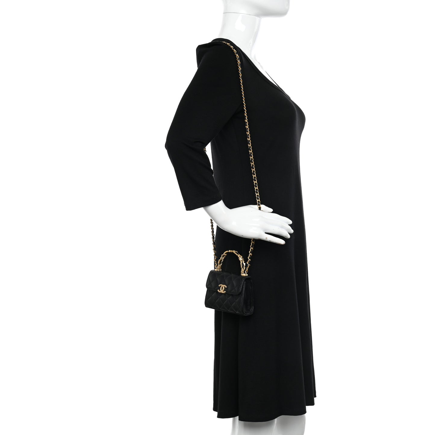 This is an authentic CHANEL Lambskin Enamel Quilted Mini Top Handle Flap in Black. This chic bag classic is crafted of soft quilted lambskin leather in black. It features a gold chain top handle with black and white resin beads, a gold chain link leather threaded shoulder strap and a facing gold Chanel CC logo. This flap opens to a black leather interior with pockets.Follow this item for alerts. Chanel is a registered trademark of Chanel. FASHIONPHILE is not affiliated with Chanel.