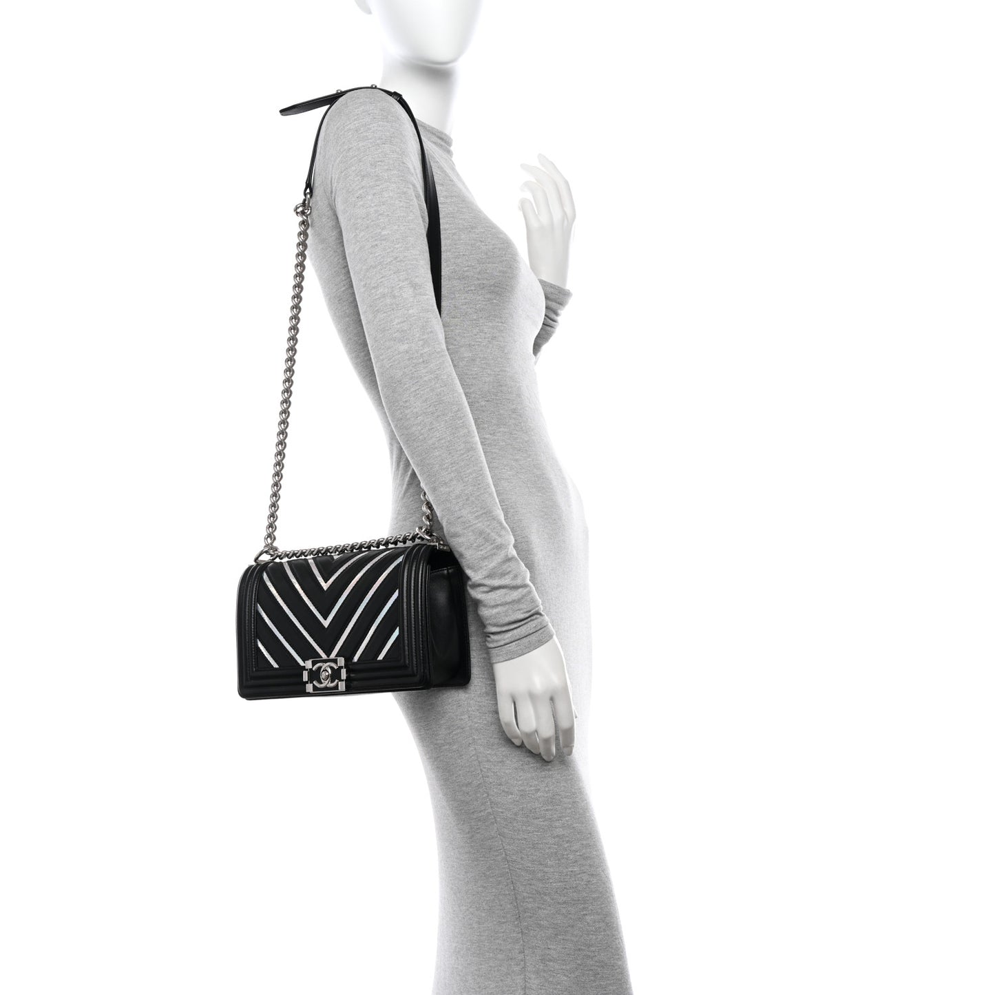 This is an authentic CHANEL Lambskin Iridescent PVC Chevron Quilted Medium Boy Flap in Black and Silver. This chic shoulder bag is crafted of smooth luxurious lambskin leather with PVC chevron quilting framed by linear quilting. The bag features a polished silver chain link and shoulder pad shoulder strap and a black resin push lock. This opens to a black fabric interior with a patch pocket.Follow this item for alerts. Chanel is a registered trademark of Chanel. FASHIONPHILE is not affiliated with Chanel.