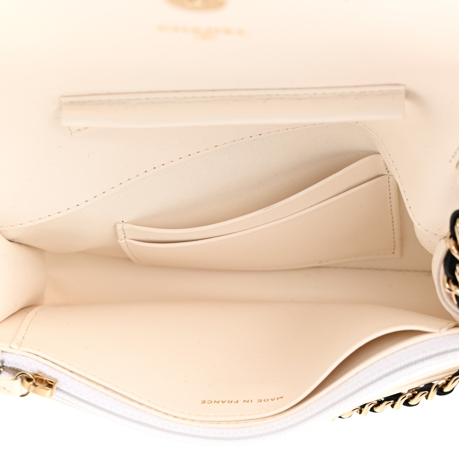 This is an authentic CHANEL Lambskin Quilted Book Wallet On Chain WOC in Black. This wallet is crafted of diamond quilted lambskin leather in black. This bag features white leather sides, a gold chain leather shoulder strap, and a small CC logo. The front flap opens to a white leather interior with card slots, a patch pocket, and a zipper compartment.Follow this item for alerts. Chanel is a registered trademark of Chanel. FASHIONPHILE is not affiliated with Chanel.