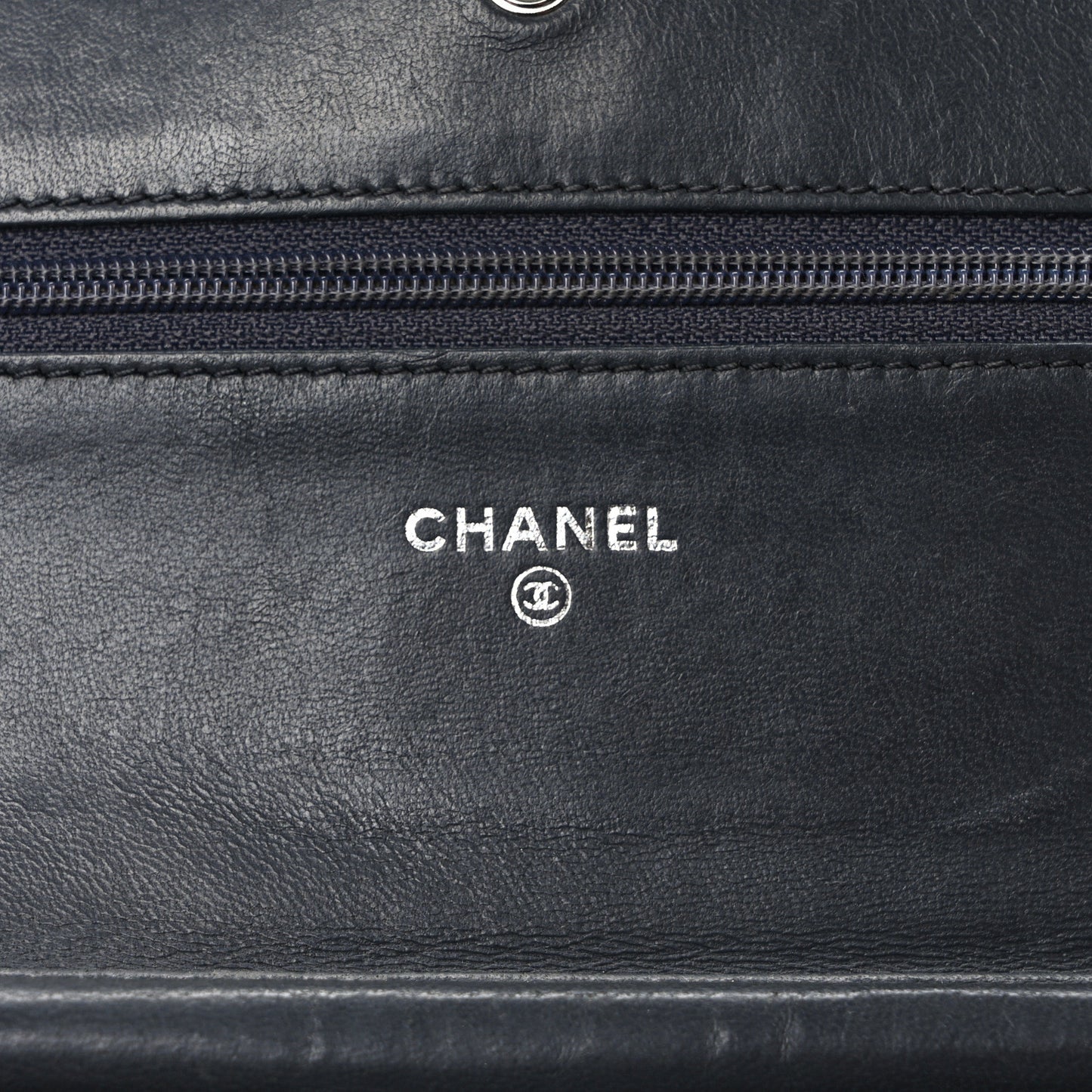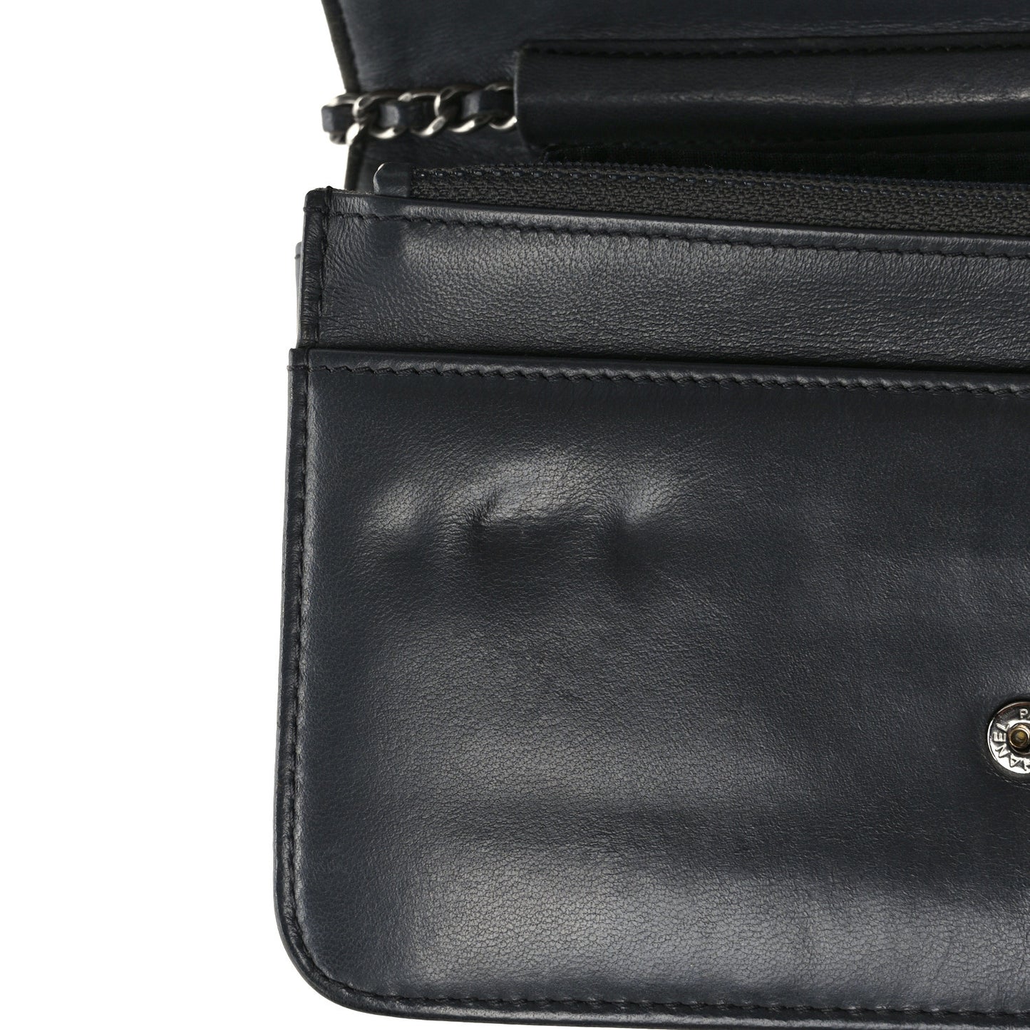 This is an authentic CHANEL Lambskin Quilted Boy Wallet On Chain WOC in Dark Grey. This wallet on chain is crafted of diamond quilted lambskin leather in dark gray with linear quilted border trim. This features silver chain links with a leather shoulder strap and a Chanel CC boy faux press lock on the flap. The magnetic closure opens to a matching fabric and leather interior with a frontal pocket, card slots, and zipper compartment.Follow this item for alerts. Chanel is a registered trademark of Chanel. FASHIONPHILE is not affiliated with Chanel.
