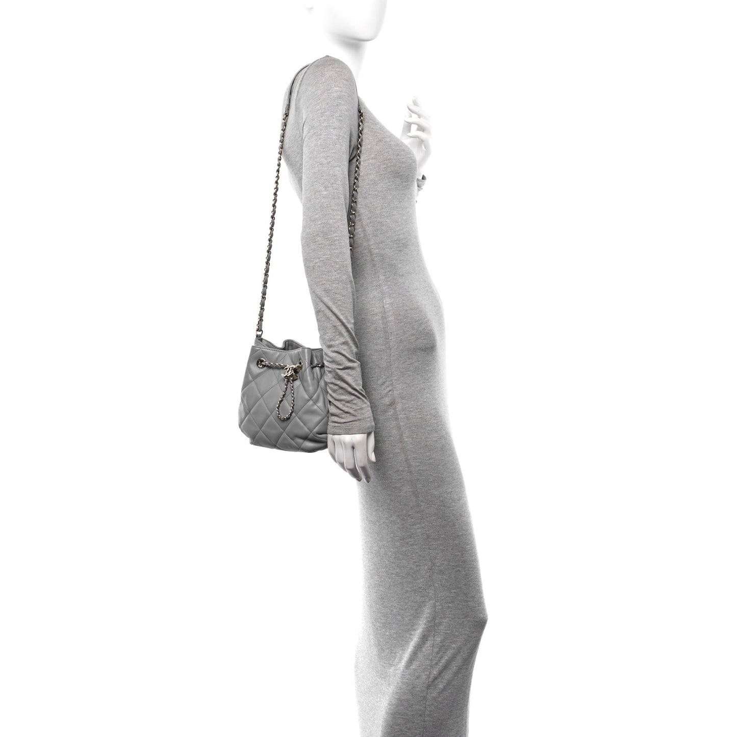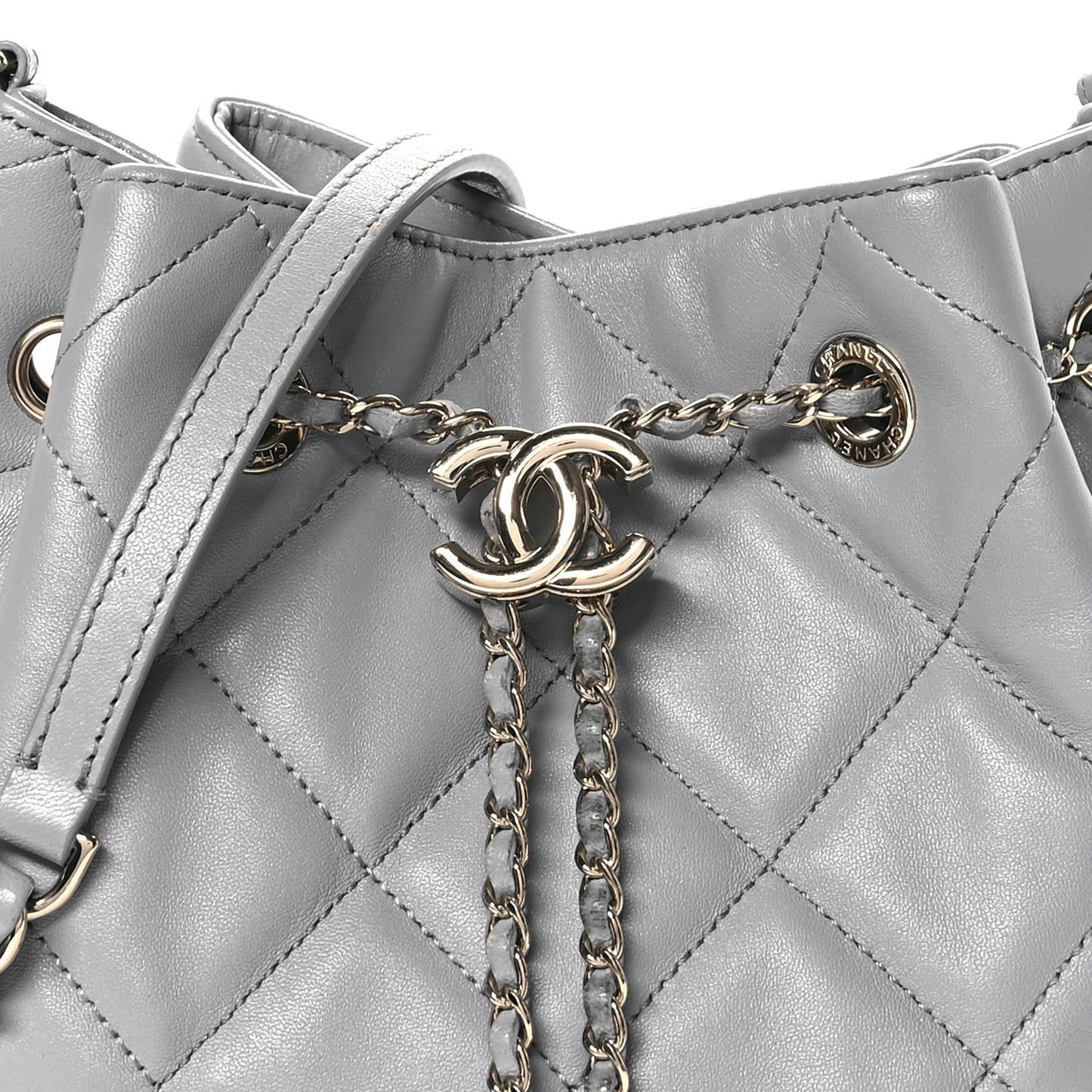 This is an authentic CHANEL Lambskin Quilted CC Dweller Drawstring Bucket Bag in Light Grey. This mini bag is crafted of grey lambskin leather with diamond quilting. It features a leather-threaded light gold chain strap with grey leather shoulder pad and a leather-threaded light gold chain top cinch strap with CC adjustment button. This opens to a grey fabric interior with a patch pocket.Follow this item for alerts. Chanel is a registered trademark of Chanel. FASHIONPHILE is not affiliated with Chanel.
