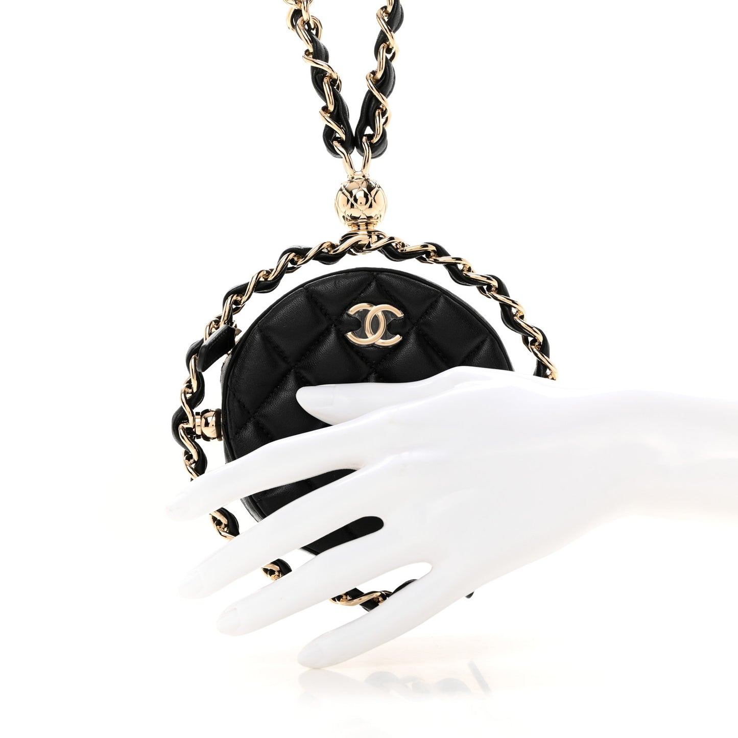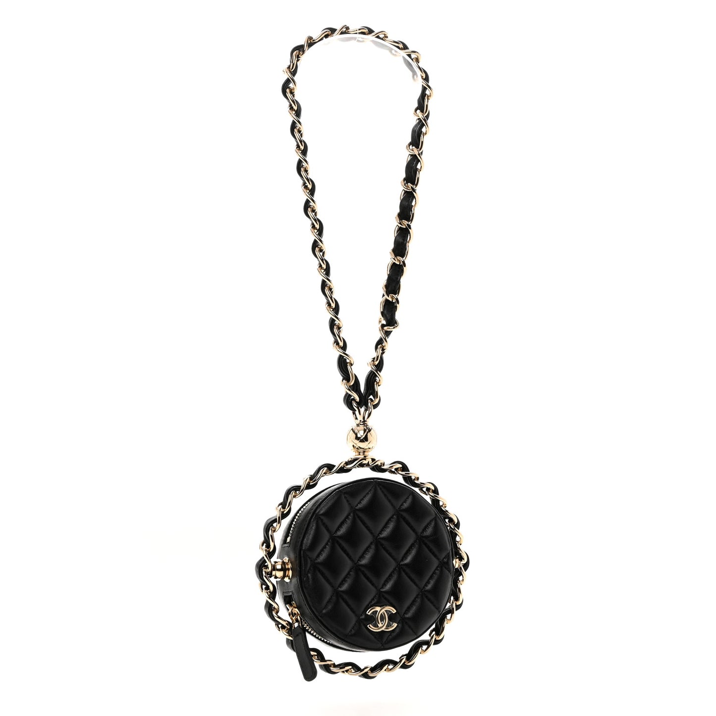 This is an authentic CHANEL Lambskin Quilted Chain Round Clutch Mini in Black. The chic mini clutch classic is crafted in soft quilted lambskin leather in black. The bag features a gold chain link leather threaded strap and a facing classic CC logo. The top zippers open the bag to a fabric interior.Follow this item for alerts. Chanel is a registered trademark of Chanel. FASHIONPHILE is not affiliated with Chanel.