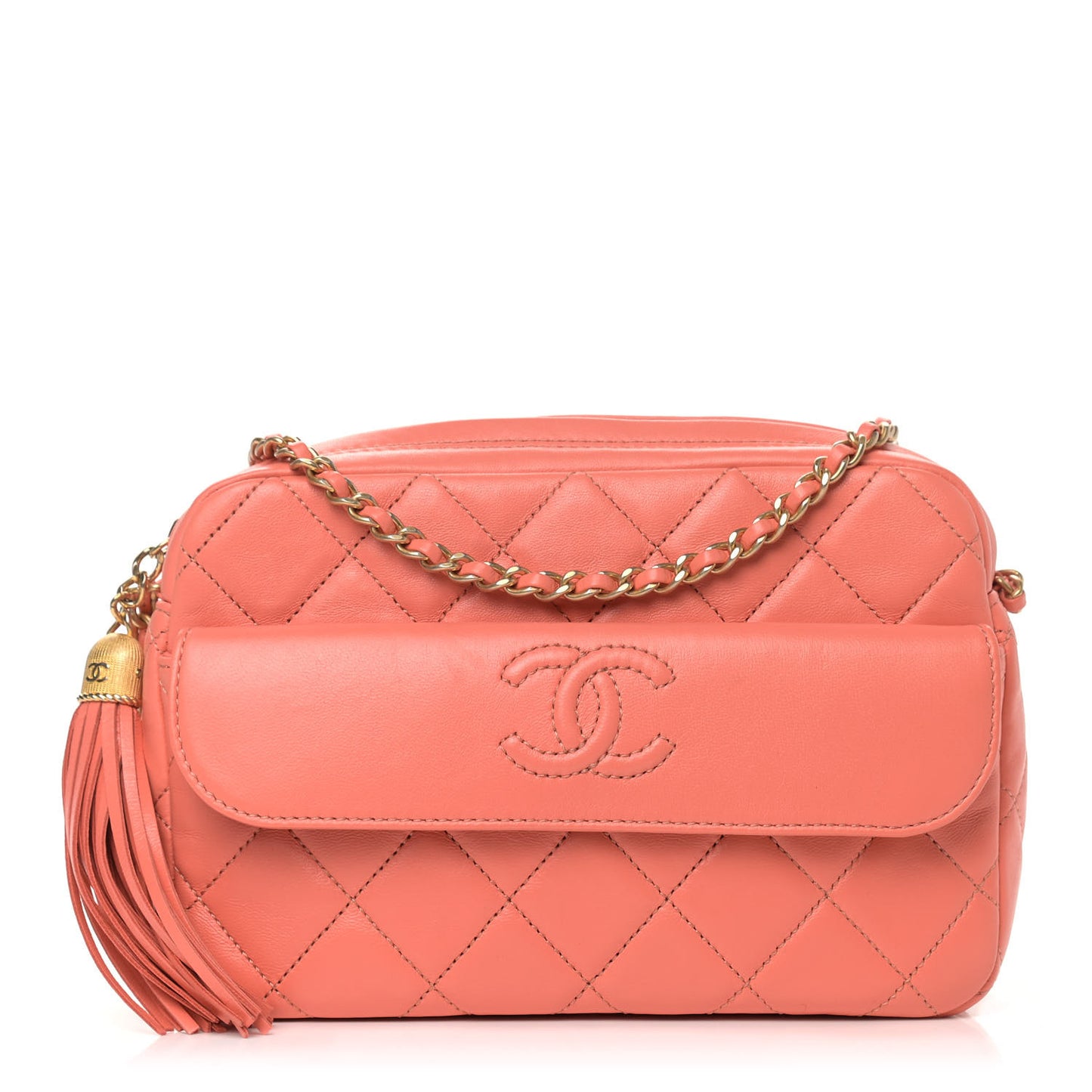 This is an authentic CHANEL Lambskin Quilted Chain & Tassel Small Camera Case in Pink. This chic shoulder bag is finely crafted of luxurious diamond quilted lambskin leather in a coral pink color. The bag features a leather threaded aged gold chain shoulder strap, a flat exterior pocket, and a Chanel CC logo. The top zipper opens to a matching interior with a zipper pocket.Follow this item for alerts. Chanel is a registered trademark of Chanel. FASHIONPHILE is not affiliated with Chanel.