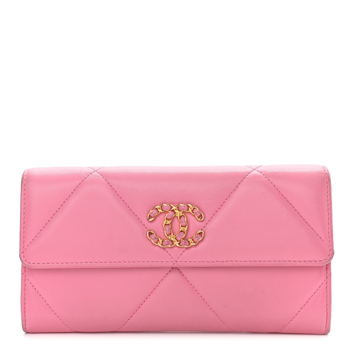 This is an authentic CHANEL Lambskin Quilted Chanel 19 Flap Wallet in Pink. This stylish wallet is crafted of luxurious quilted lambskin in pink with an aged gold leather threaded Chanel CC logo. The wallet opens to a matching leather and fabric interior with patch pockets, card slots and, a zippered compartment.Follow this item for alerts. Chanel is a registered trademark of Chanel. FASHIONPHILE is not affiliated with Chanel.