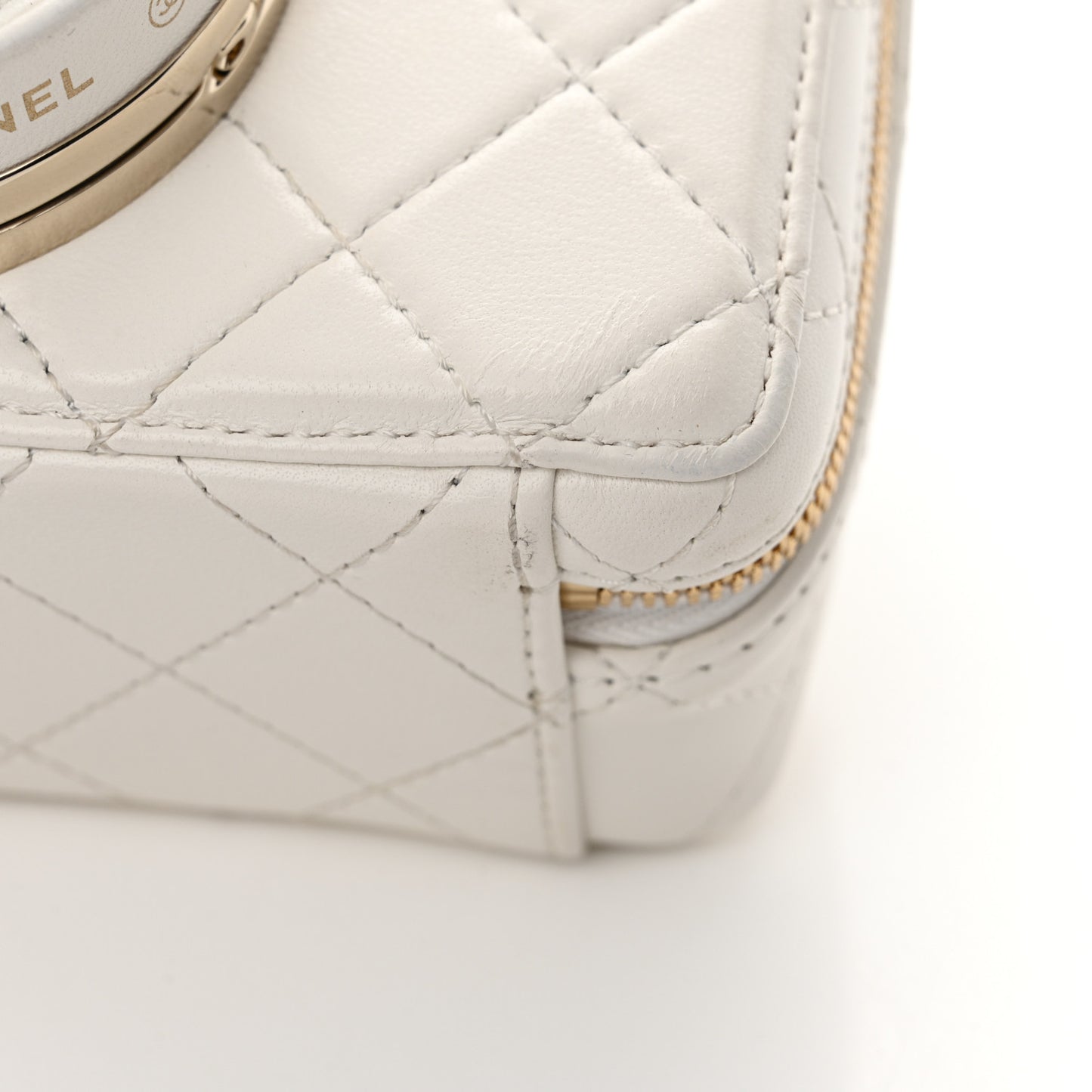 This authentic Chanel Lambskin Quilted Coco Click Bag in White. This chic shoulder bag is crafted with white diamond quilted lambskin. It features a gold chain link leather threaded shoulder strap, a front Chanel CC "lens cover" that reveals a hidden mirror, and gold hardware. The wrap around zipper opens to a white fabric interior with small flat pockets.Follow this item for alerts. Chanel is a registered trademark of Chanel. FASHIONPHILE is not affiliated with Chanel.
