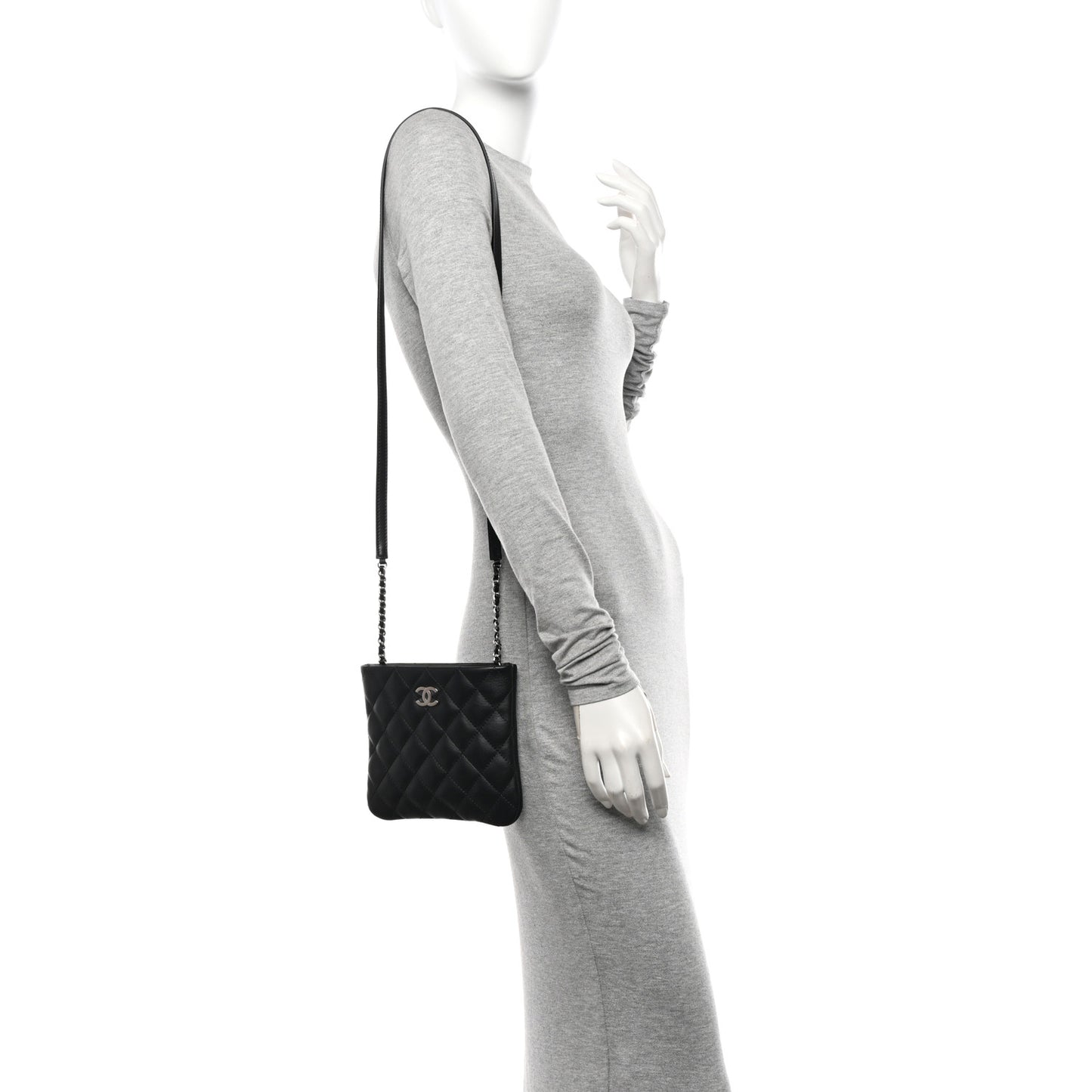 This is an authentic CHANEL Lambskin Quilted Crossbody Bag in Black. This compact shoulder bag is crafted of lambskin leather in diamond stitch. The bag features a long leather and silver chain shoulder strap and top zipper closure which opens to a black canvas interior with a zipper pocket.Follow this item for alerts. Chanel is a registered trademark of Chanel. FASHIONPHILE is not affiliated with Chanel.