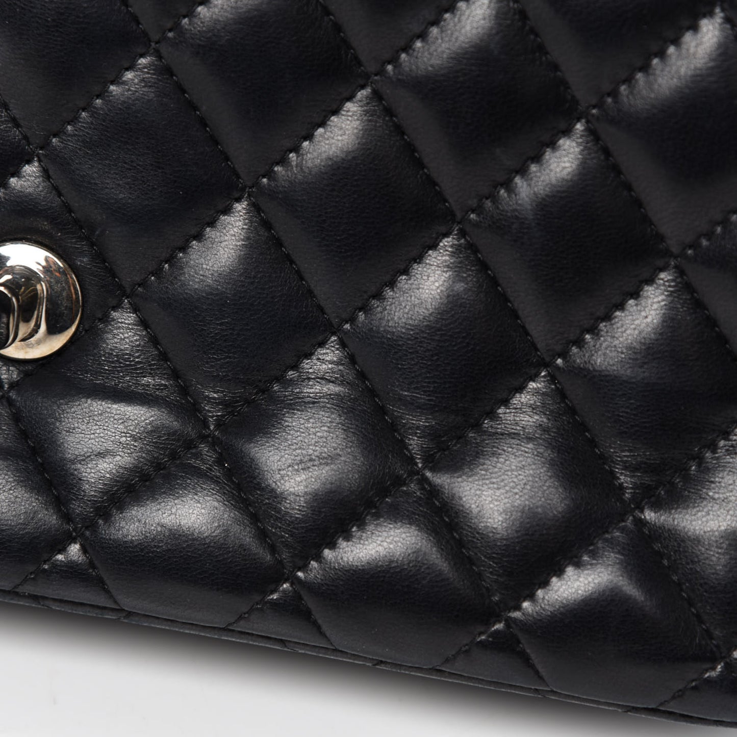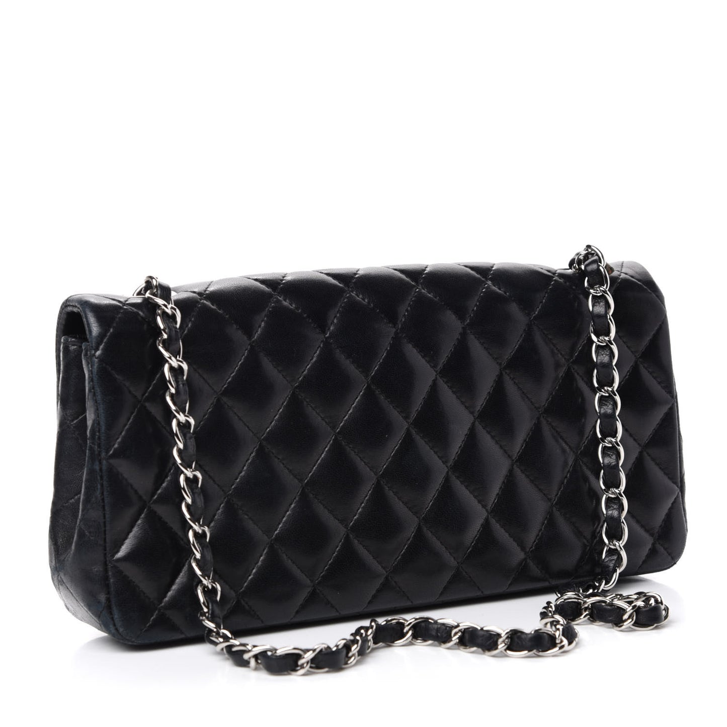 This is an authentic CHANEL Lambskin Quilted East West Flap in Black. This stylish shoulder bag is crafted of luxurious padded diamond stitched lambskin leather in black. The bag features a polished silver chain link leather threaded shoulder strap and a silver CC turn lock on the front flap. This opens to a black leather interior with patch pockets.Follow this item for alerts. Chanel is a registered trademark of Chanel. FASHIONPHILE is not affiliated with Chanel.