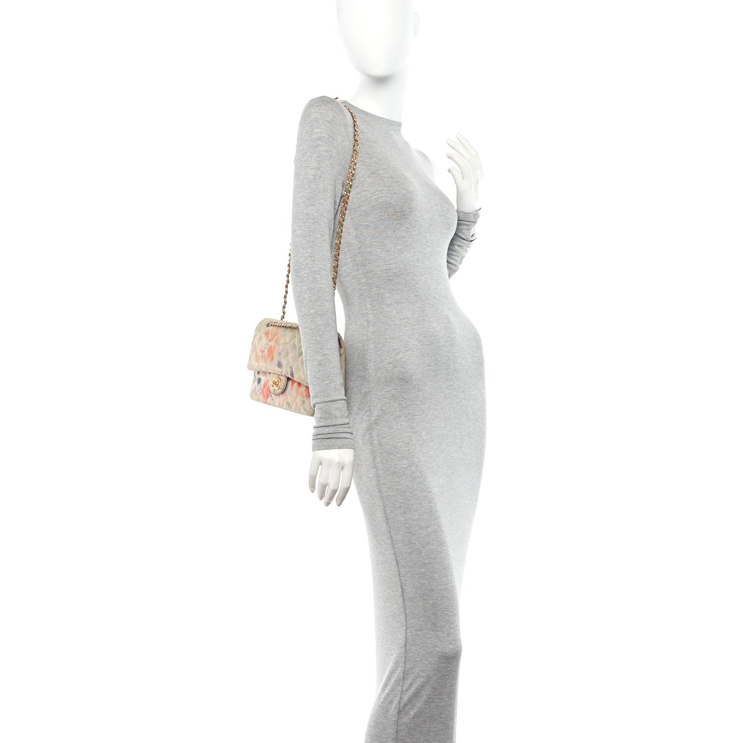 This is an authentic CHANEL Lambskin Quilted Medium Double Flap in Multicolor. This stunning medium sized shoulder bag is crafted of diamond quilted lambskin leather in watercolor print. The shoulder bag features polished gold chain link shoulder straps threaded with leather and a facing flap with a polished gold Chanel CC turn lock. ThisĀ opensĀ to a second flap and an orange fabric interior with patch pockets and a stitched CC logo on the inner flap.Follow this item for alerts.Ā Chanel is a registered trademark of Chanel. FASHIONPHILE is not affiliated with Chanel.