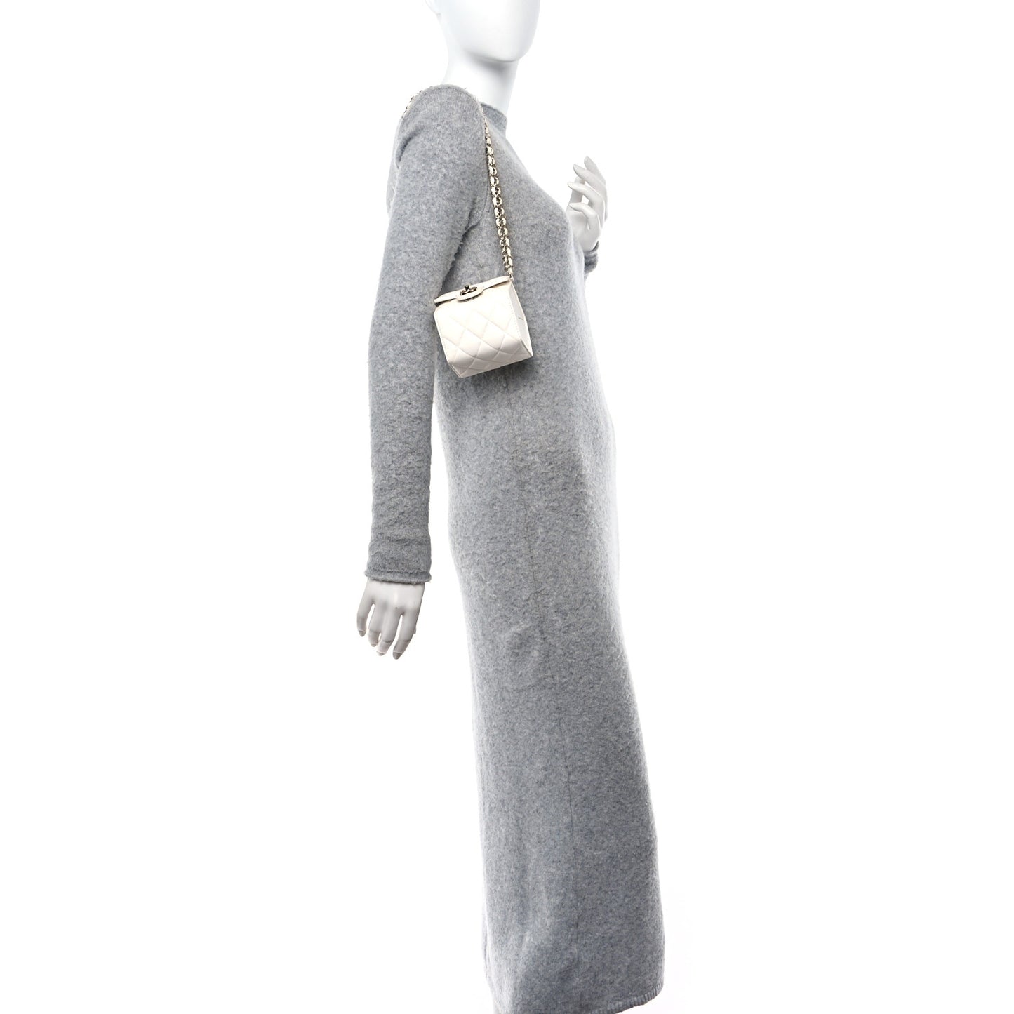This is an authentic CHANEL Lambskin Quilted Foldable Jewelry Box With Chain in White. This mini clutch is crafted of luxurious diamond quilted lambskin leather in white. The bag features a polished gold chain link leather threaded shoulder strap and a polished gold Chanel CC logo on the flap.Follow this item for alerts. Chanel is a registered trademark of Chanel. FASHIONPHILE is not affiliated with Chanel.