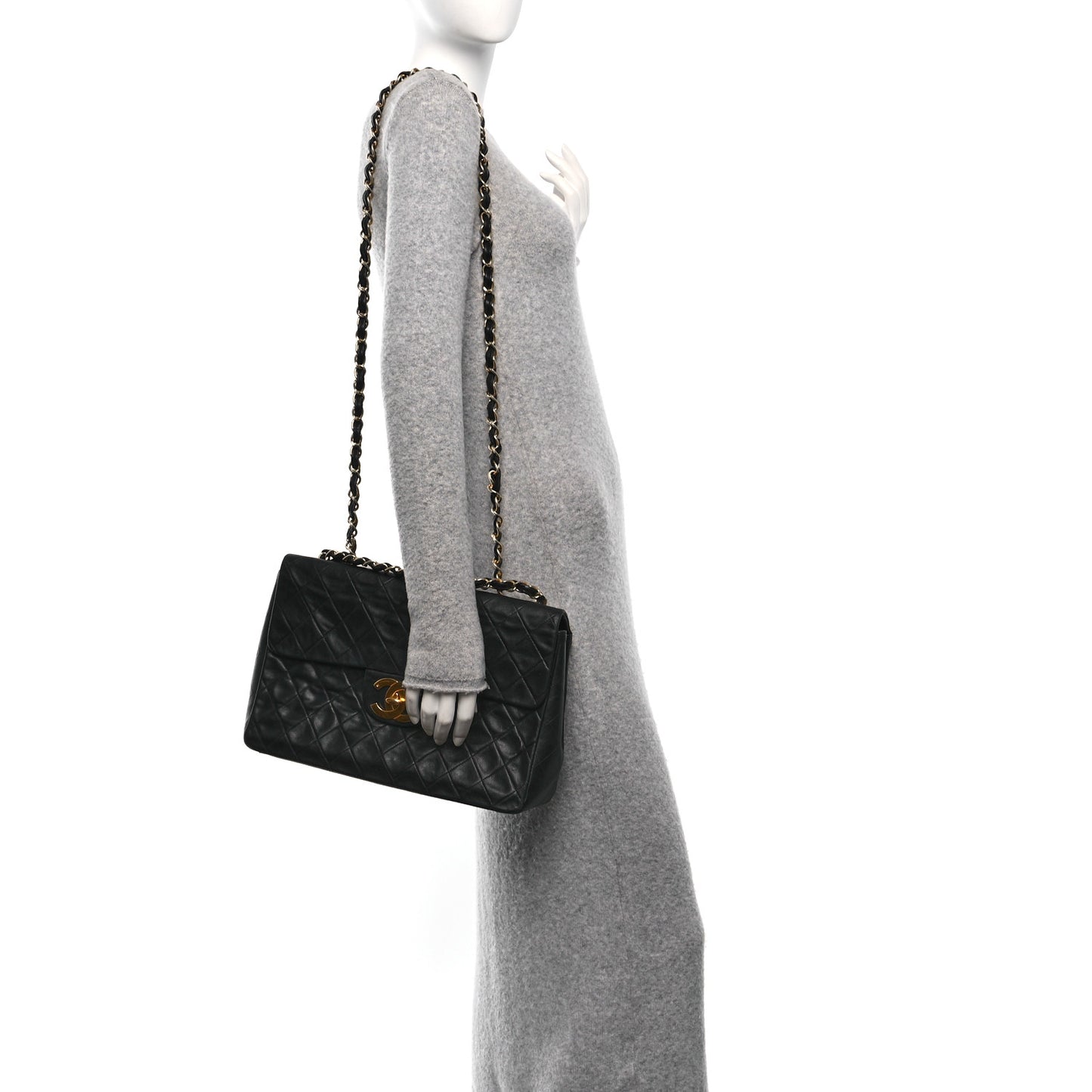 This is an authentic CHANEL Lambskin Quilted Jumbo Single Flap in Black. This shoulder bag is crafted of soft and supple diamond-quilted lambskin leather in black. The bag features a leather-threaded polished gold chain-link shoulder strap, a rear patch pocket, and a matching gold-plated classic CC turn-lock on the crossover flap. The flap opens to a red leather interior with a patch and zipper pocket.Follow this item for alerts. Chanel is a registered trademark of Chanel. FASHIONPHILE is not affiliated with Chanel.