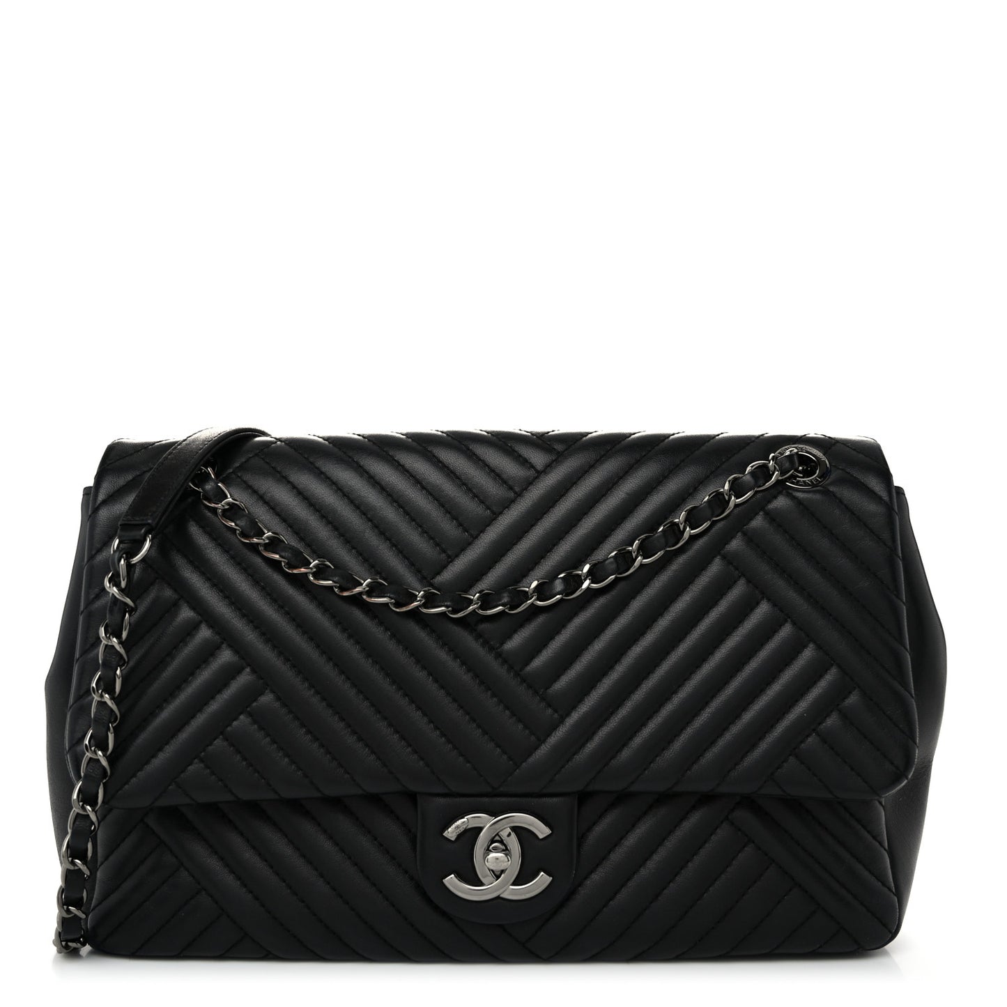 This is an authentic CHANEL Lambskin Quilted Large CC Crossing Flap in Black. This chic classic flap shoulder bag is crafted of luxurious chevron quilted lambskin leather in black. The bag features a ruthenium chain link leather threaded shoulder straps, and a facing ruthenium Chanel CC turn lock. This opens the facing flap to a black fabric interior with a zipper pocket.Follow this item for alerts. Chanel is a registered trademark of Chanel. FASHIONPHILE is not affiliated with Chanel.