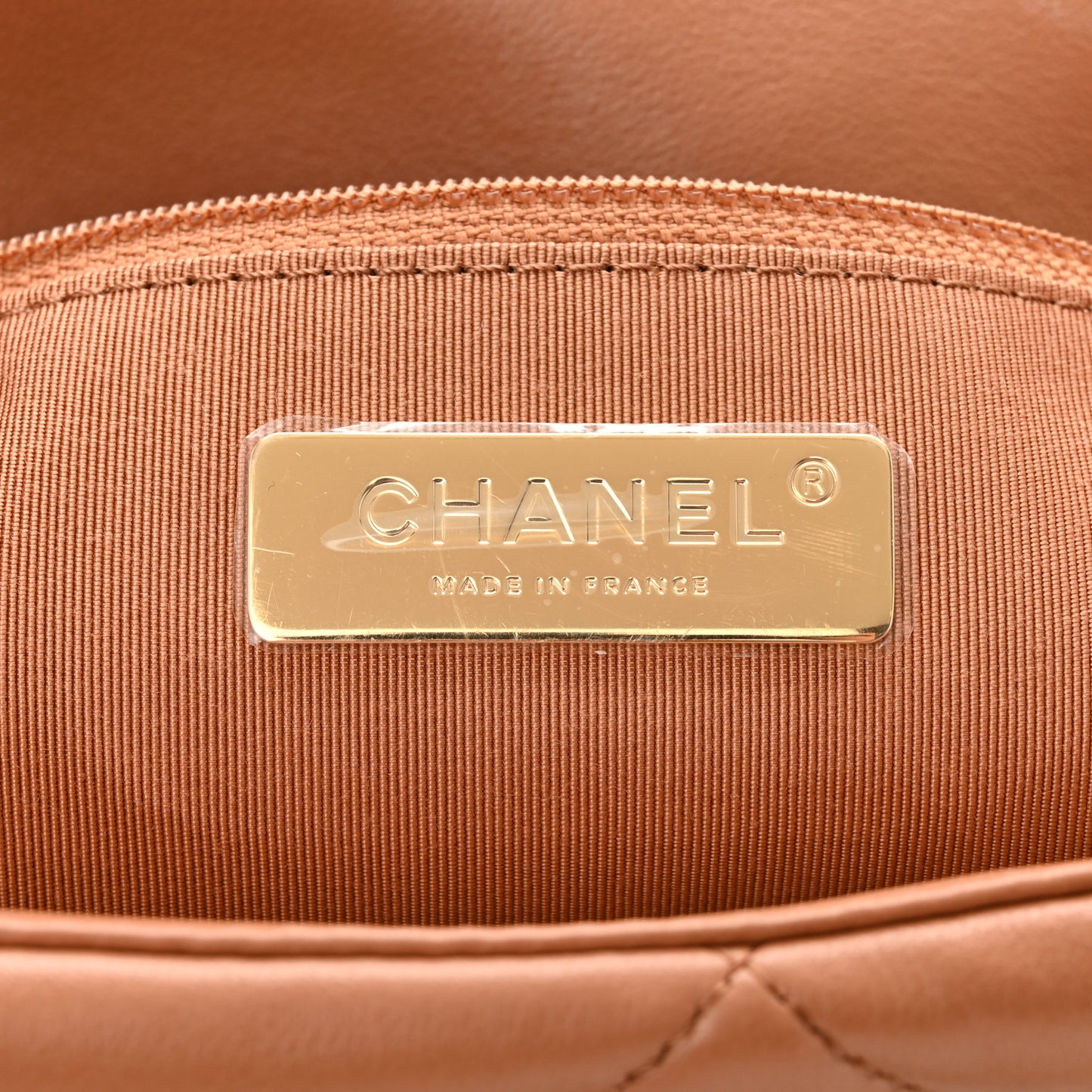 This is an authentic CHANEL Lambskin Quilted Large Chanel 19 Flap in Brown. This stylish shoulder bag is crafted of diamond quilted lambskin leather in caramel brown. The refined bag features a Chanel CC turn-lock on the flap and a leather threaded aged gold and ruthenium chain-link shoulder strap with a shoulder pad. The front flap opens to a fabric interior with a zipper pocket.Follow this item for alerts. Chanel is a registered trademark of Chanel. FASHIONPHILE is not affiliated with Chanel.