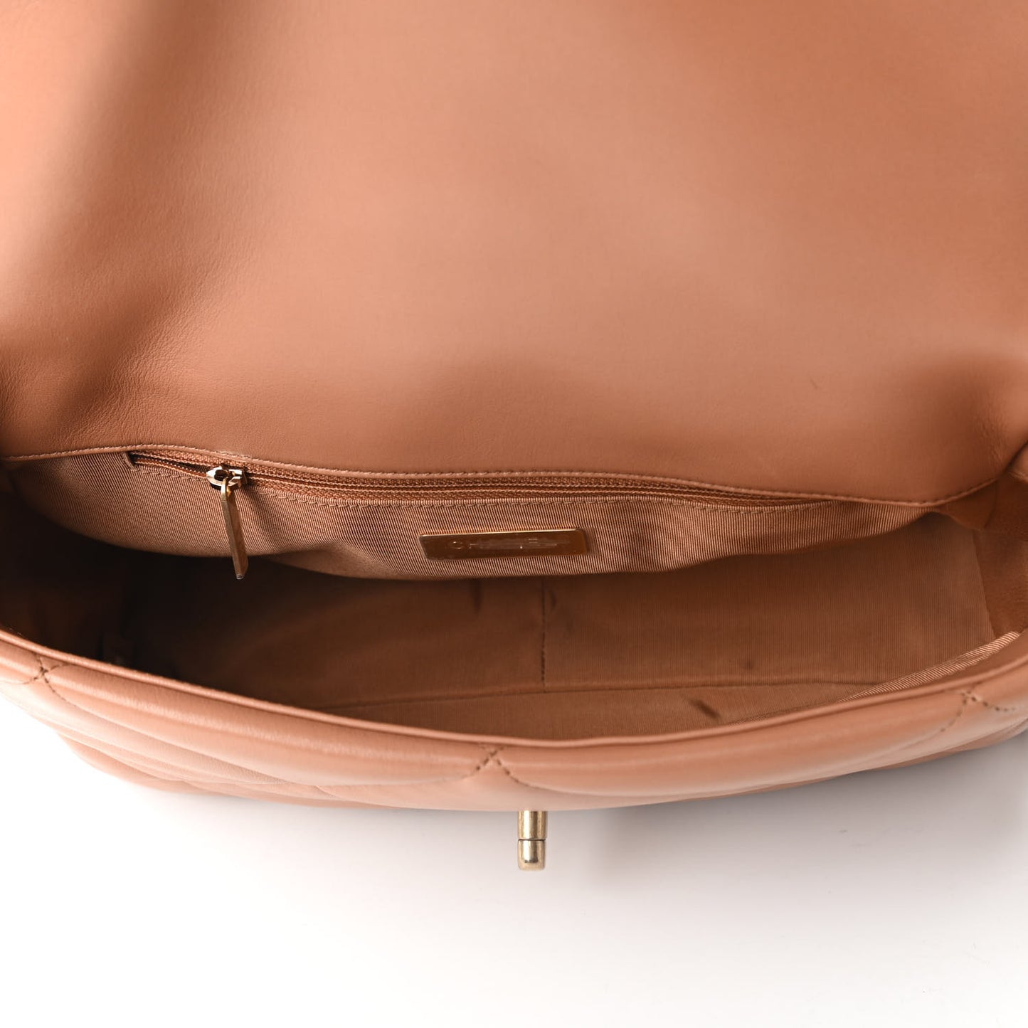 This is an authentic CHANEL Lambskin Quilted Large Chanel 19 Flap in Brown. This stylish shoulder bag is crafted of diamond quilted lambskin leather in caramel brown. The refined bag features a Chanel CC turn-lock on the flap and a leather threaded aged gold and ruthenium chain-link shoulder strap with a shoulder pad. The front flap opens to a fabric interior with zipper and patch pockets. This bag is ideal for any occasion with a timeless style from Chanel.Follow this item for alerts. Chanel is a registered trademark of Chanel. FASHIONPHILE is not affiliated with Chanel.
