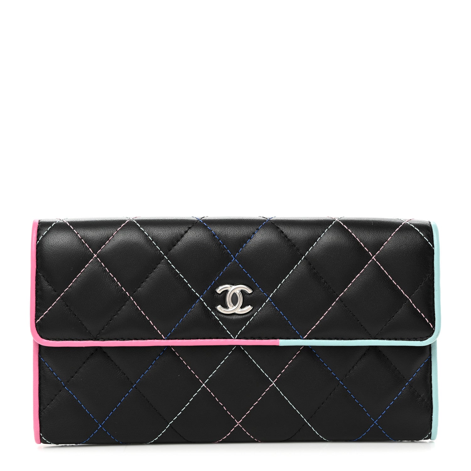 This is an authentic CHANEL Lambskin Quilted Long Flap Wallet in Multicolor. This chic clutch wallet is crafted of diamond quilted luxurious black lambskin leather, colorful leather trim and stitching, and a Chanel CC logo in silver. The zipper opens to a partitioned black leather and fabric interior with two panels for card slots and a zipper compartment.Follow this item for alerts. Chanel is a registered trademark of Chanel. FASHIONPHILE is not affiliated with Chanel.