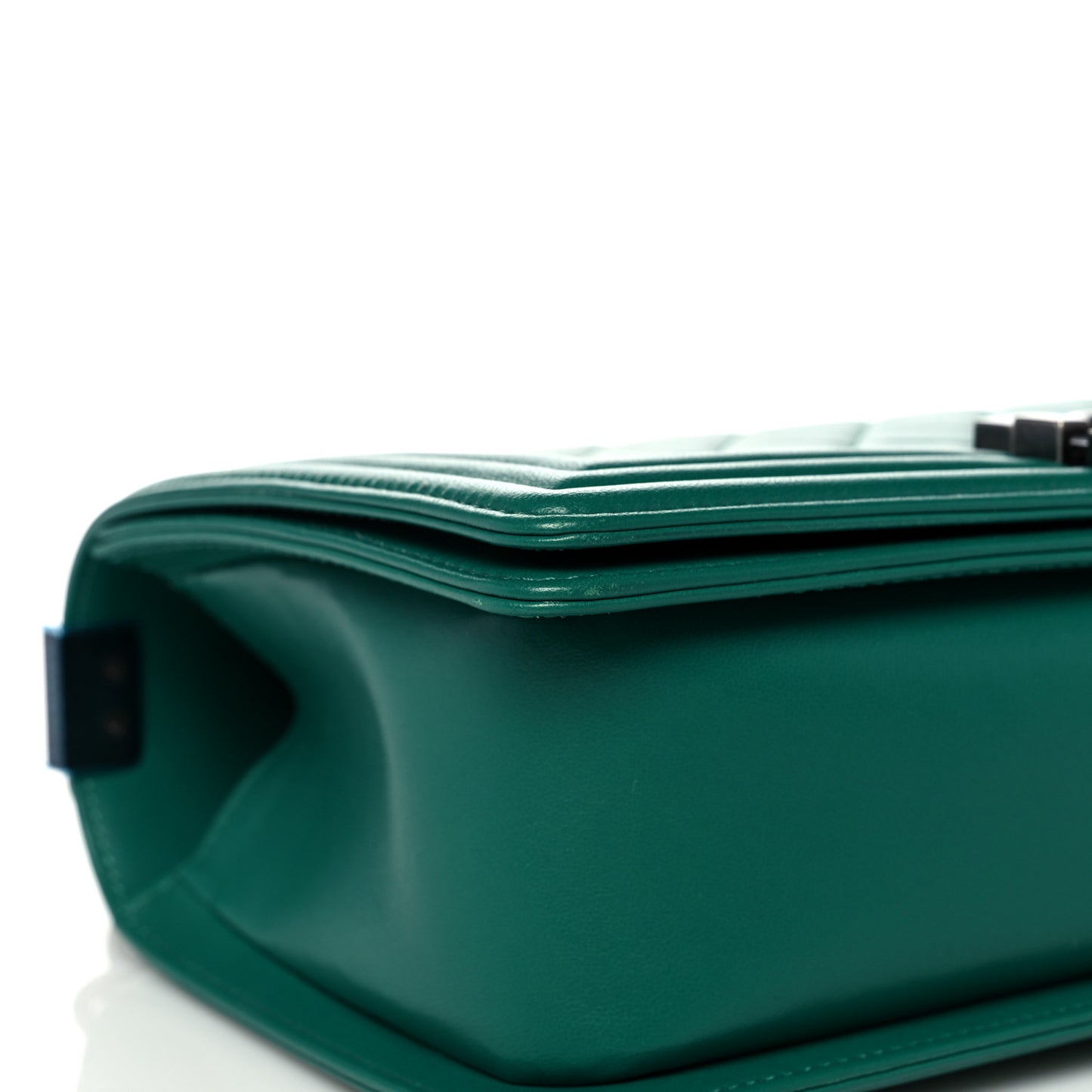This is an authentic CHANEL Lambskin Quilted Medium Boy Flap in Green. This chic shoulder bag is crafted of diamond quilted luxurious lambskin leather with a linear quilted border in green. The bag features a ruthenium chain link shoulder strap with a leather shoulder pad and a ruthenium Chanel boy CC push lock. The flap opens to a green fabric interior with a long patch pocket.Follow this item for alerts. Chanel is a registered trademark of Chanel. FASHIONPHILE is not affiliated with Chanel.