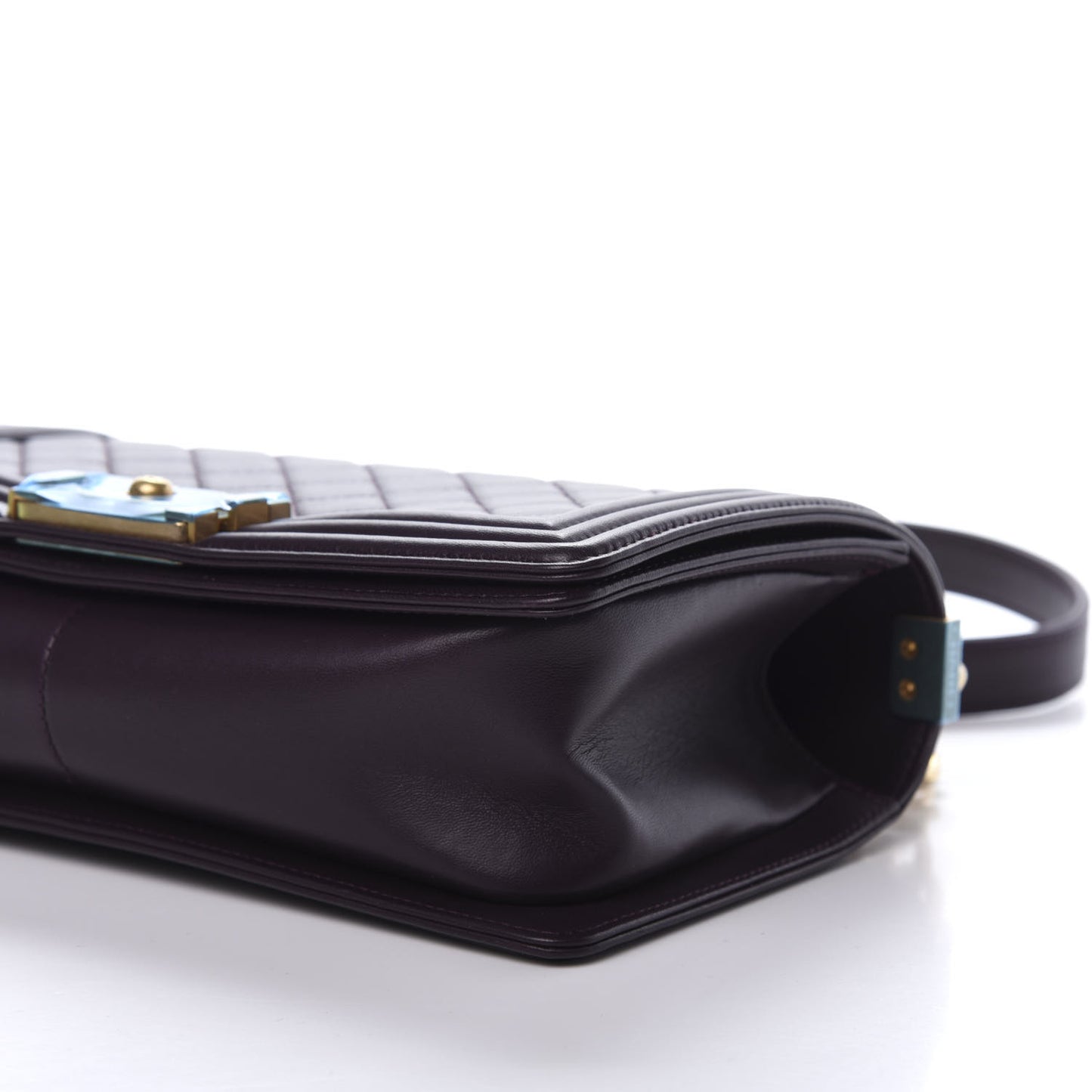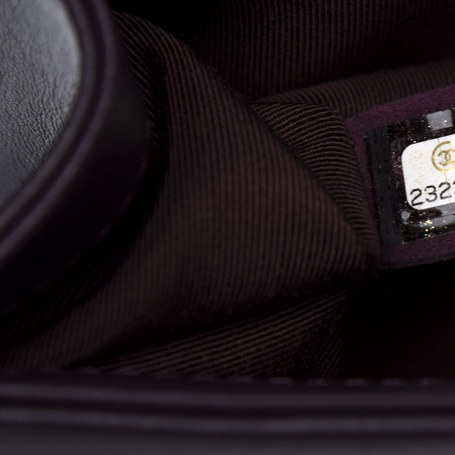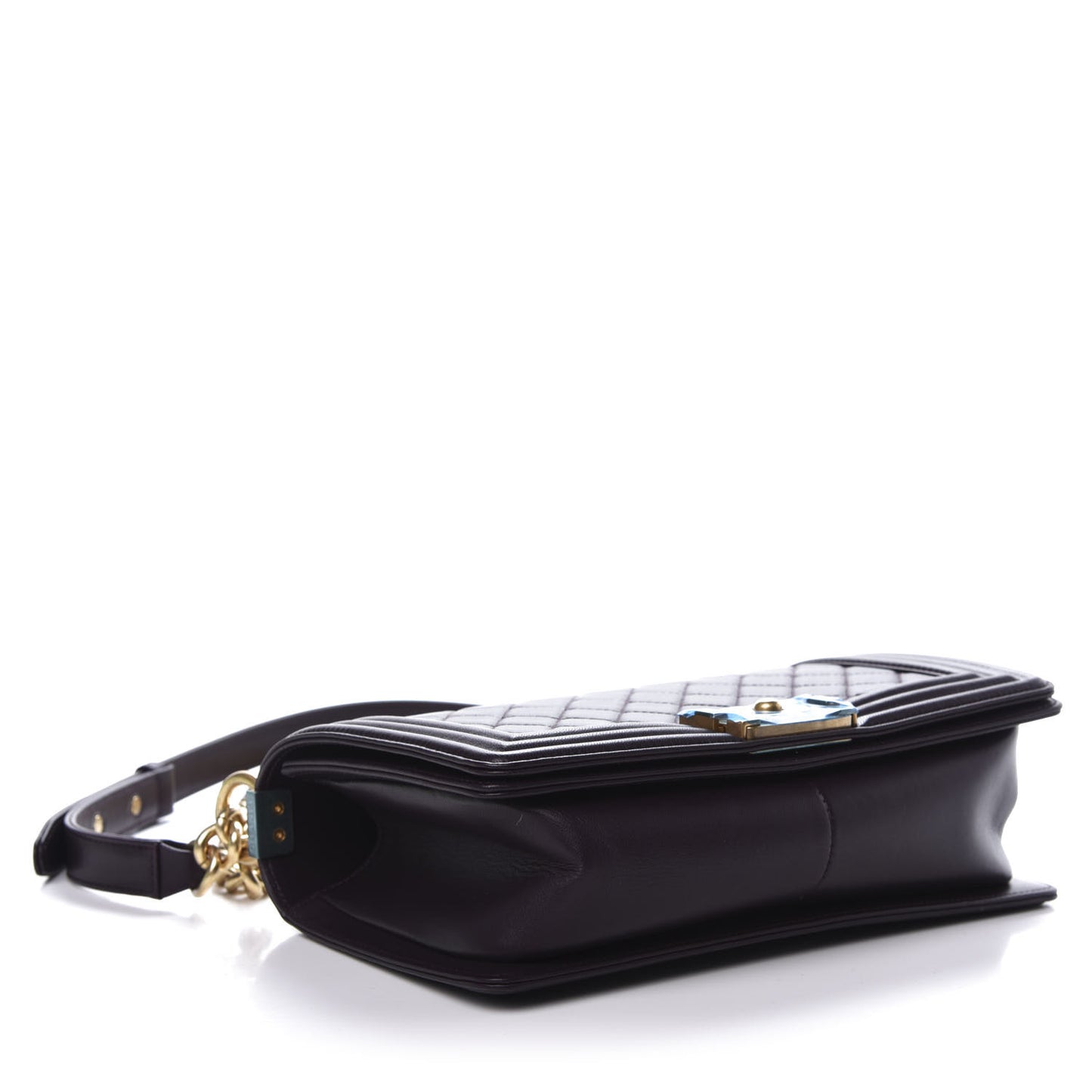 This is an authentic CHANEL Calfskin Quilted Medium Boy Flap in Purple. This chic flap bag is crafted of diamond quilted lambskin leather in burgundy. The bag features an aged gold chain link shoulder strap with a leather shoulder pad, and a frontal aged gold press lock. This opens the front flap to a red fabric interior with a single flat pocket.Follow this item for alerts. Chanel is a registered trademark of Chanel. FASHIONPHILE is not affiliated with Chanel.
