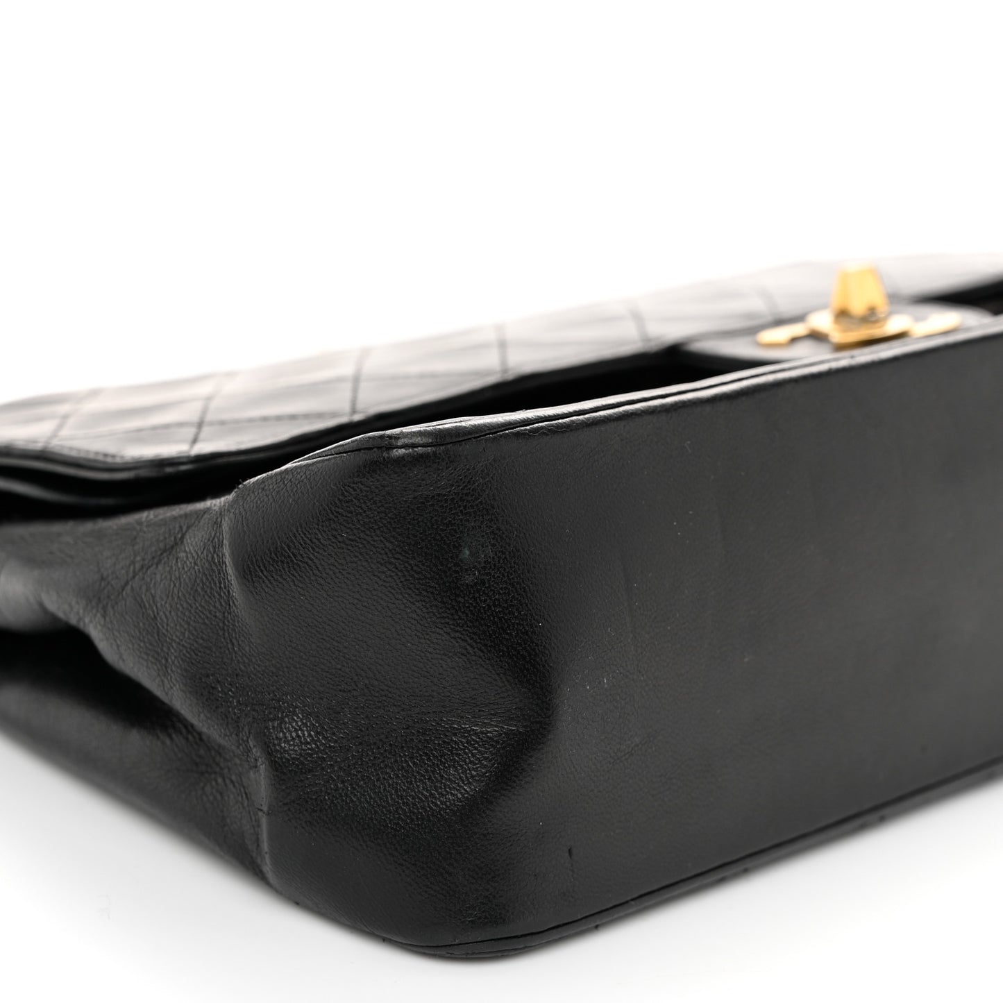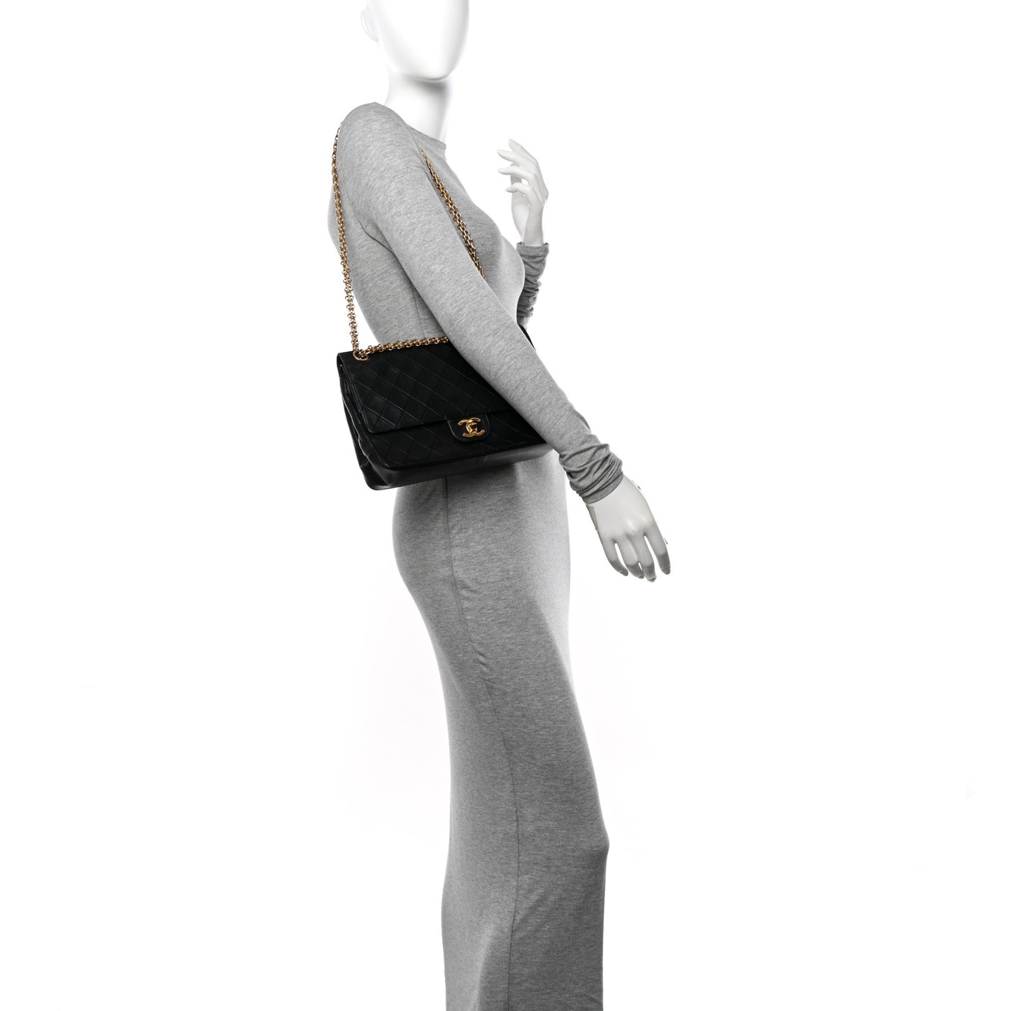 This is an authentic CHANEL Lambskin Quilted Medium Double Flap Bijoux Chain in Black. This is constructed of black diamond-quilted lambskin leather, with a distressed finish. The bag features a polished gold bijoux chain shoulder strap, a back patch pocket, and a facing gold plated classic CC turn lock. The flap opens to reveal an inner flap and a spacious burgundy fabric interior with patch pockets.Follow this item for alerts. Chanel is a registered trademark of Chanel. FASHIONPHILE is not affiliated with Chanel.