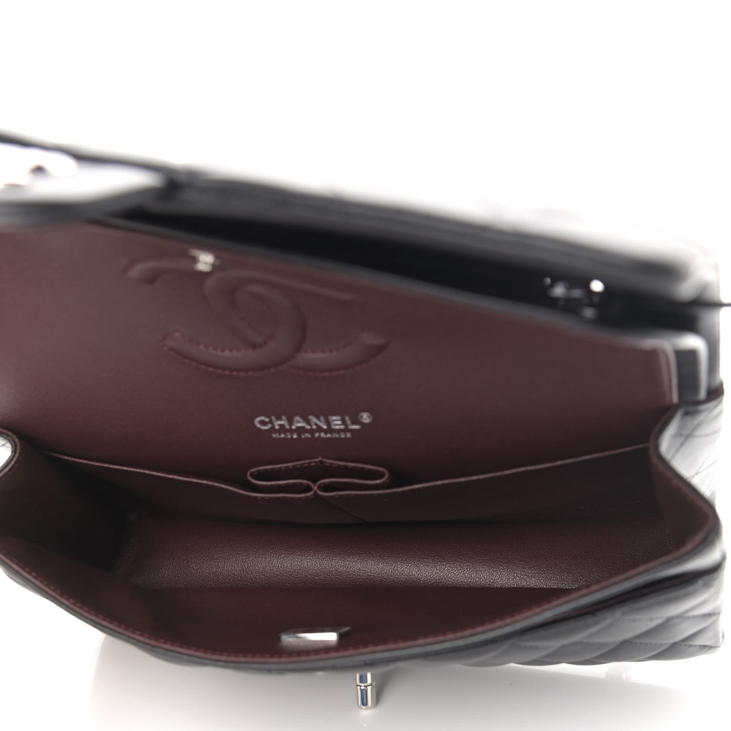 This is an authentic CHANEL Lambskin Quilted Medium Double Flap in Black. This classic style is beautifully crafted of soft black diamond quilted lambskin leather. This bag features a polished silver chain link shoulder straps threaded with black leather, an exterior flat pocket, and a front flap with a CC turn lock. This shoulder bagĀ opens to an interior of burgundy leather with a stitched CC logo with patch pockets.Follow this item for alerts.Ā Chanel is a registered trademark of Chanel. FASHIONPHILE is not affiliated with Chanel.