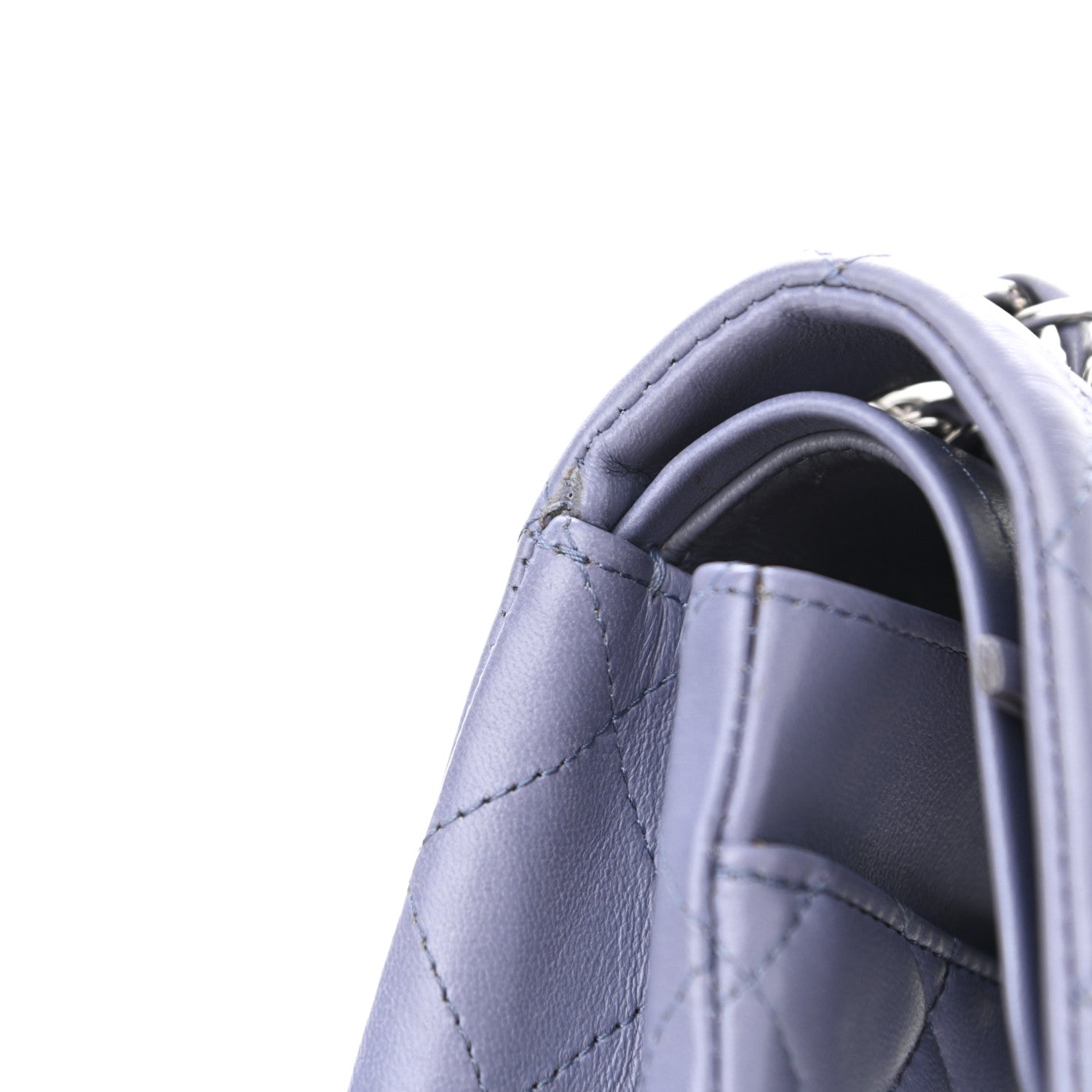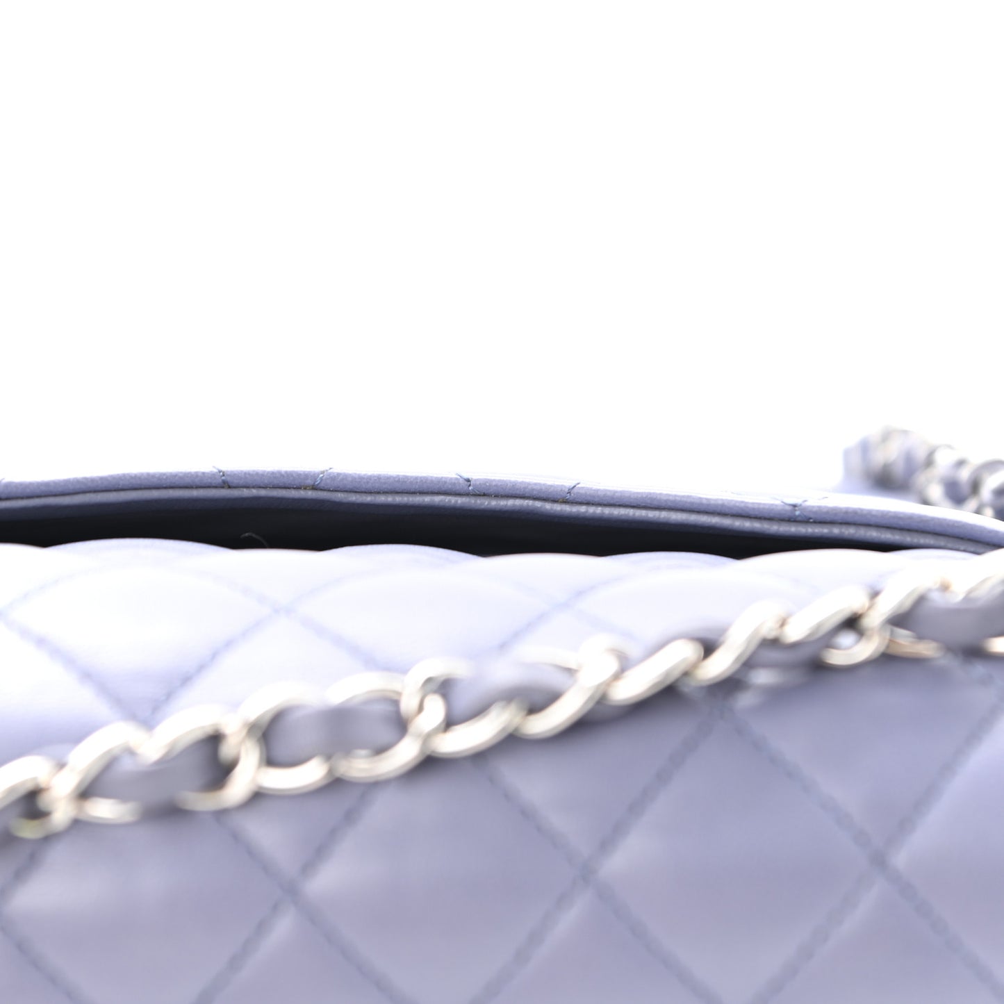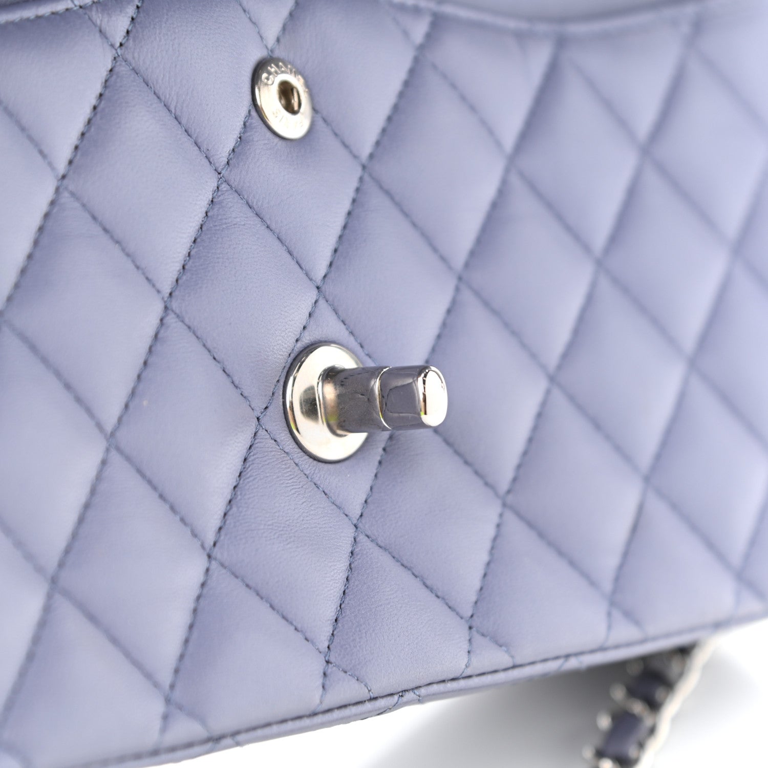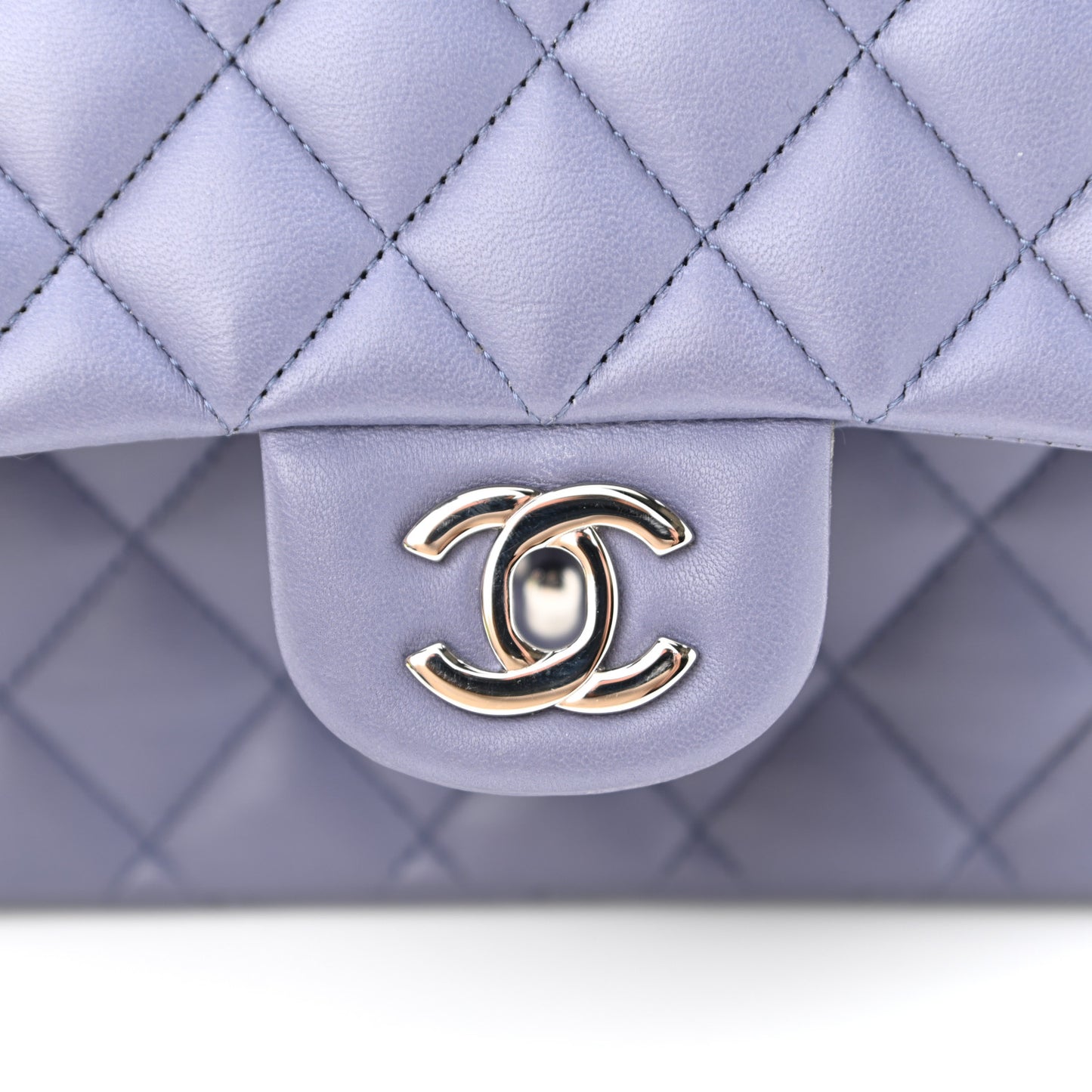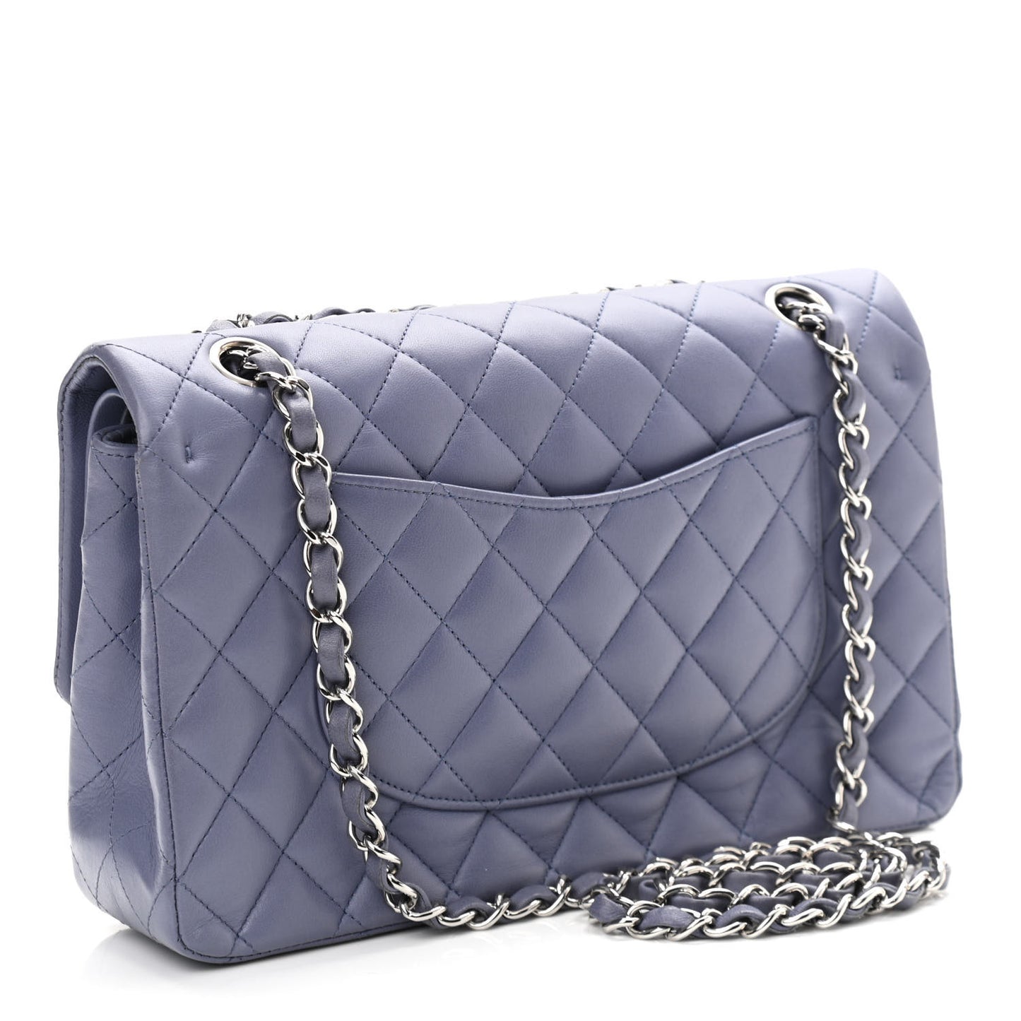 This is an authentic CHANEL Lambskin Quilted Medium Double Flap in Light Purple. This classic shoulder bag is crafted of diamond quilted lambskin leather. It features a leather-threaded polished silver chain shoulder strap, a flat rear pocket, and a silver CC turn-lock on the flap. This opens to reveal an inner flap and a matching leather interior with patch pockets.Follow this item for alerts. Chanel is a registered trademark of Chanel. FASHIONPHILE is not affiliated with Chanel.