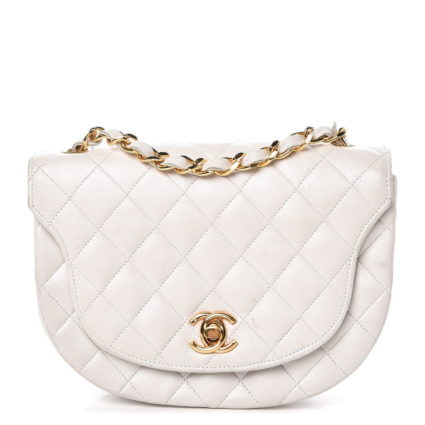 This is an authentic CHANEL Lambskin Quilted Mini Half Moon Flap in White. This chic classic model, circa 1989-1991, is finely composed of luxuriously supple diamond quilted lambskin leather in white. The bag features a gold chain link shoulder strap and a gold Chanel CC turn lock. This opens the front flap to a matching leather interior with a zipper and a patch pocket. This is a beautiful vintage shoulder bag for day or evening with the timeless quality and style of Chanel!Follow this item for alerts. Chanel is a registered trademark of Chanel. FASHIONPHILE is not affiliated with Chanel.