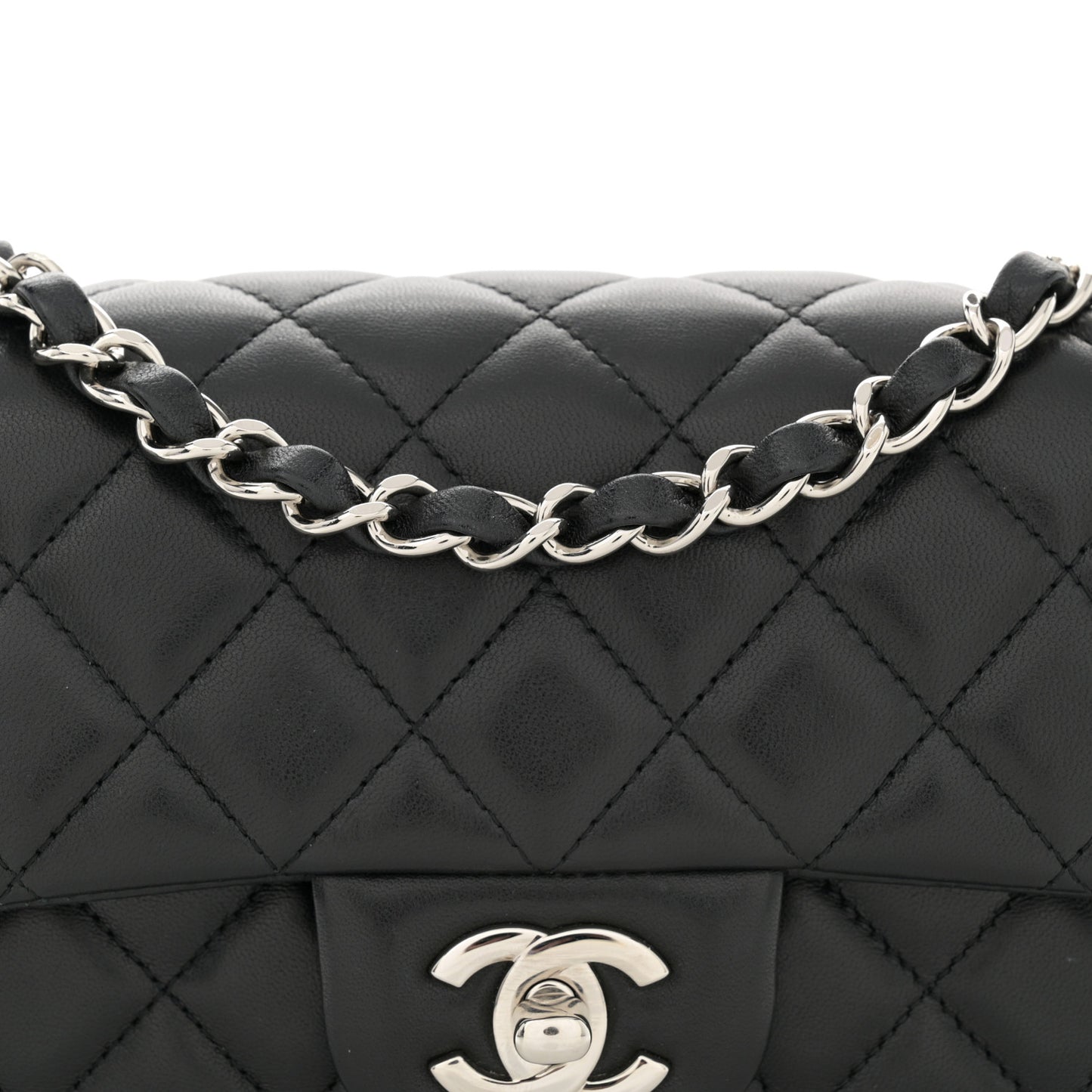 This is an authentic CHANEL Lambskin Quilted Mini Rectangular Flap in Black. The chic mini crossbody is crafted of soft diamond-quilted lambskin leather in black. The bag features a silver chain-link leather threaded shoulder strap and a silver classic CC turn-lock. This opens the flap to a black leather interior with zipper and patch pockets.Follow this item for alerts. Chanel is a registered trademark of Chanel. FASHIONPHILE is not affiliated with Chanel.