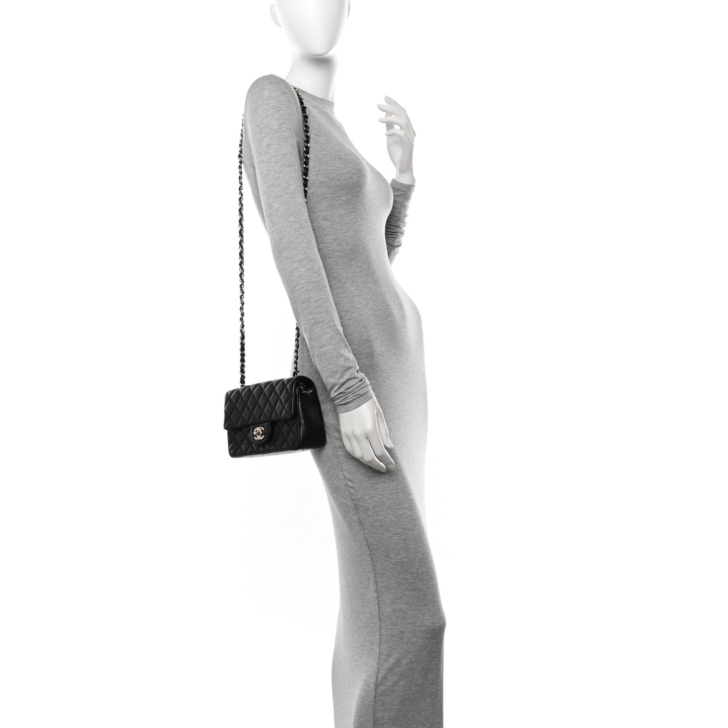 This is an authentic CHANEL Lambskin Quilted Mini Rectangular Flap in Black. The chic mini crossbody is crafted of soft diamond quilted lambskin leather in black. The bag features a light gold chain-link leather threaded shoulder strap and a light gold classic CC turn-lock. This opens the flap to a black leather interior with zipper and patch pockets.Follow this item for alerts. Chanel is a registered trademark of Chanel. FASHIONPHILE is not affiliated with Chanel.