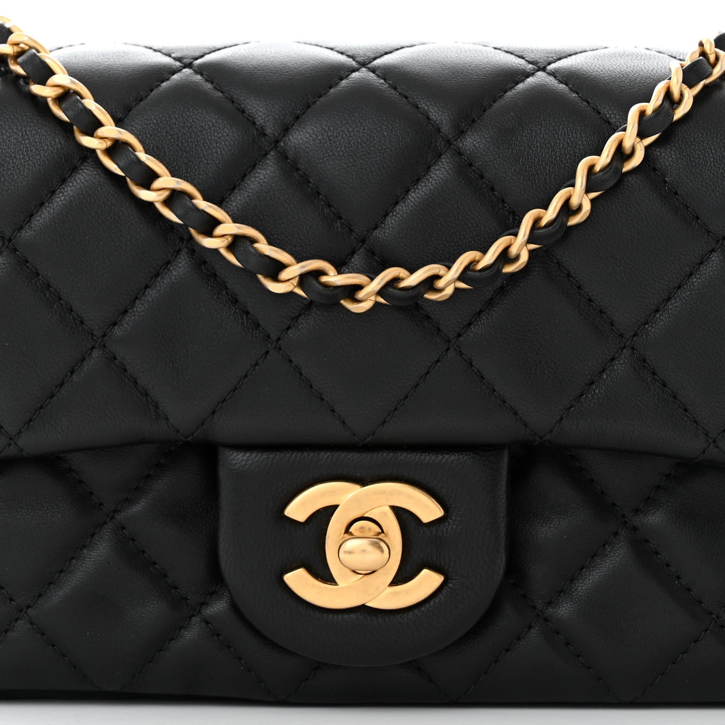 This is an authentic CHANEL Lambskin Quilted CC Pearl Crush Mini Rectangular Flap in Black. The chic mini crossbody classic is crafted in soft quilted lambskin leather in black. The bag features an aged gold chain link leather threaded shoulder strap with a strap adjuster and a facing classic aged gold CC turn lock. This opens the flap to a gold leather interior with zipper and patch pockets.Follow this item for alerts. Chanel is a registered trademark of Chanel. FASHIONPHILE is not affiliated with Chanel.