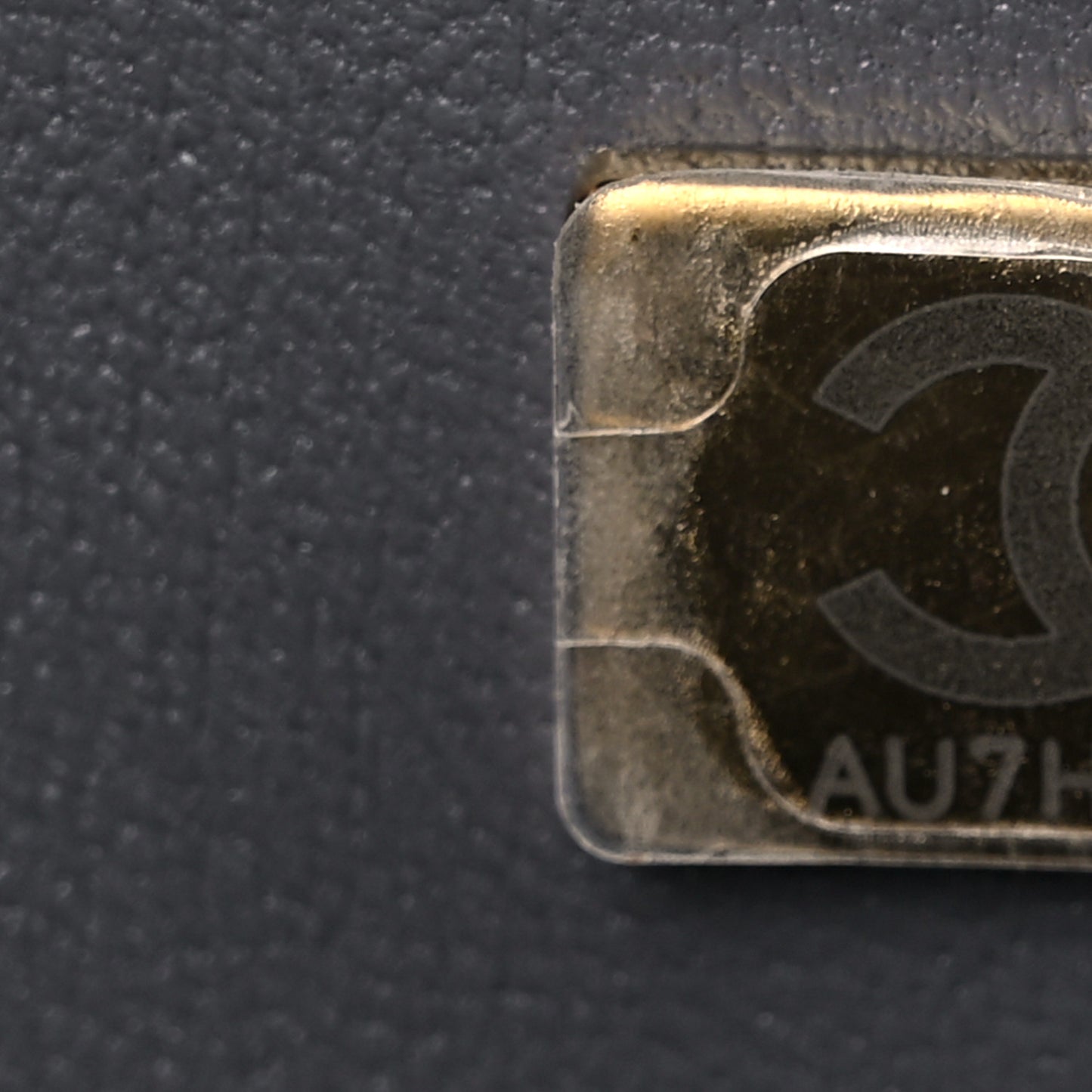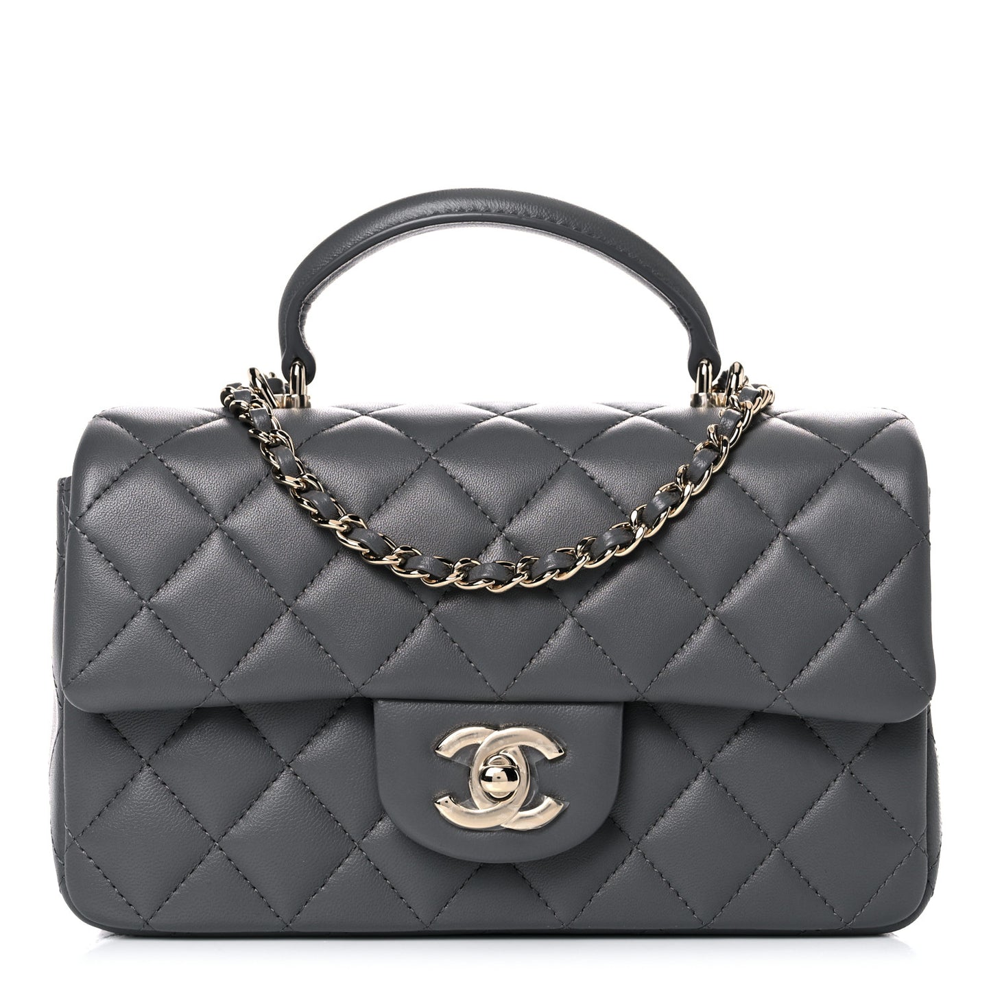 This is an authentic CHANEL Lambskin Quilted Mini Top Handle Rectangular Flap in Dark Grey. This petite shoulder bag is crafted of diamond quilted lambskin leather in light grey. The crossbody bag features a top handle, a polished gold chain-link leather threaded shoulder strap and a frontal flap with a Chanel CC turn lock. The flap opens to a smooth light grey leather with zipper and patch pockets.Follow this item for alerts. Chanel is a registered trademark of Chanel. FASHIONPHILE is not affiliated with Chanel.