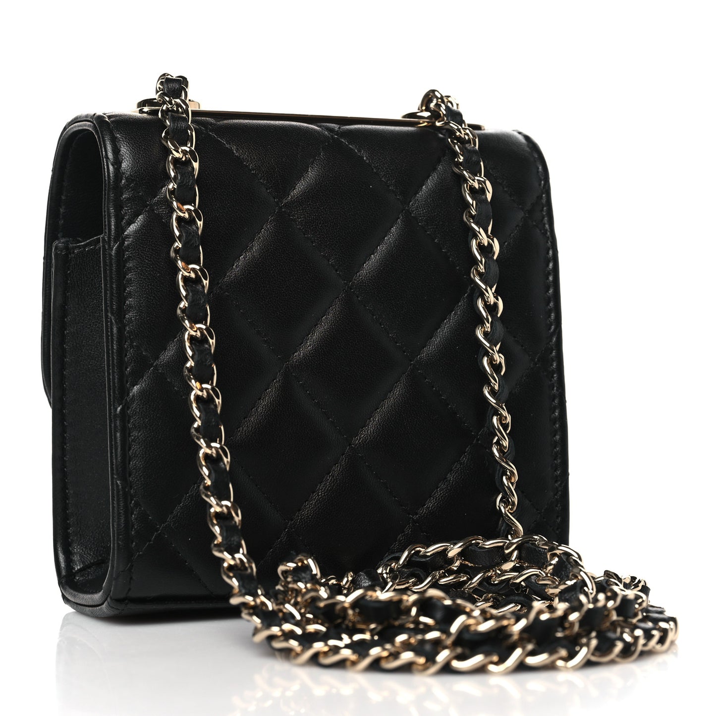This is an authentic CHANEL Lambskin Quilted Mini Trendy CC Chain Wallet in Black. This stylish wallet is crafted of luxurious quilted lambskin leather in black. The bag features a long polished gold chain link leather threaded shoulder strap, a small front Chanel CC closure, and a Chanel plate on the top. This opens to a matching black fabric interior with card slots.Follow this item for alerts. Chanel is a registered trademark of Chanel. FASHIONPHILE is not affiliated with Chanel.