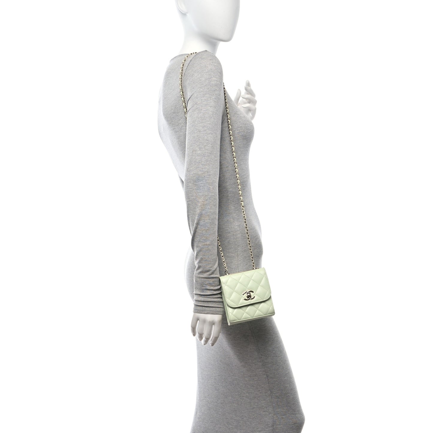This is an authentic CHANEL Lambskin Quilted Mini Trendy CC Chain Wallet in Sea Green. This stylish wallet is crafted of luxurious quilted lambskin leather in light green. The bag features a long polished gold chain link leather threaded shoulder strap, a small front gold Chanel CC closure and a Chanel plate on the top. This opens to a matching fabric interior with a panel of card slots.Follow this item for alerts. Chanel is a registered trademark of Chanel. FASHIONPHILE is not affiliated with Chanel.