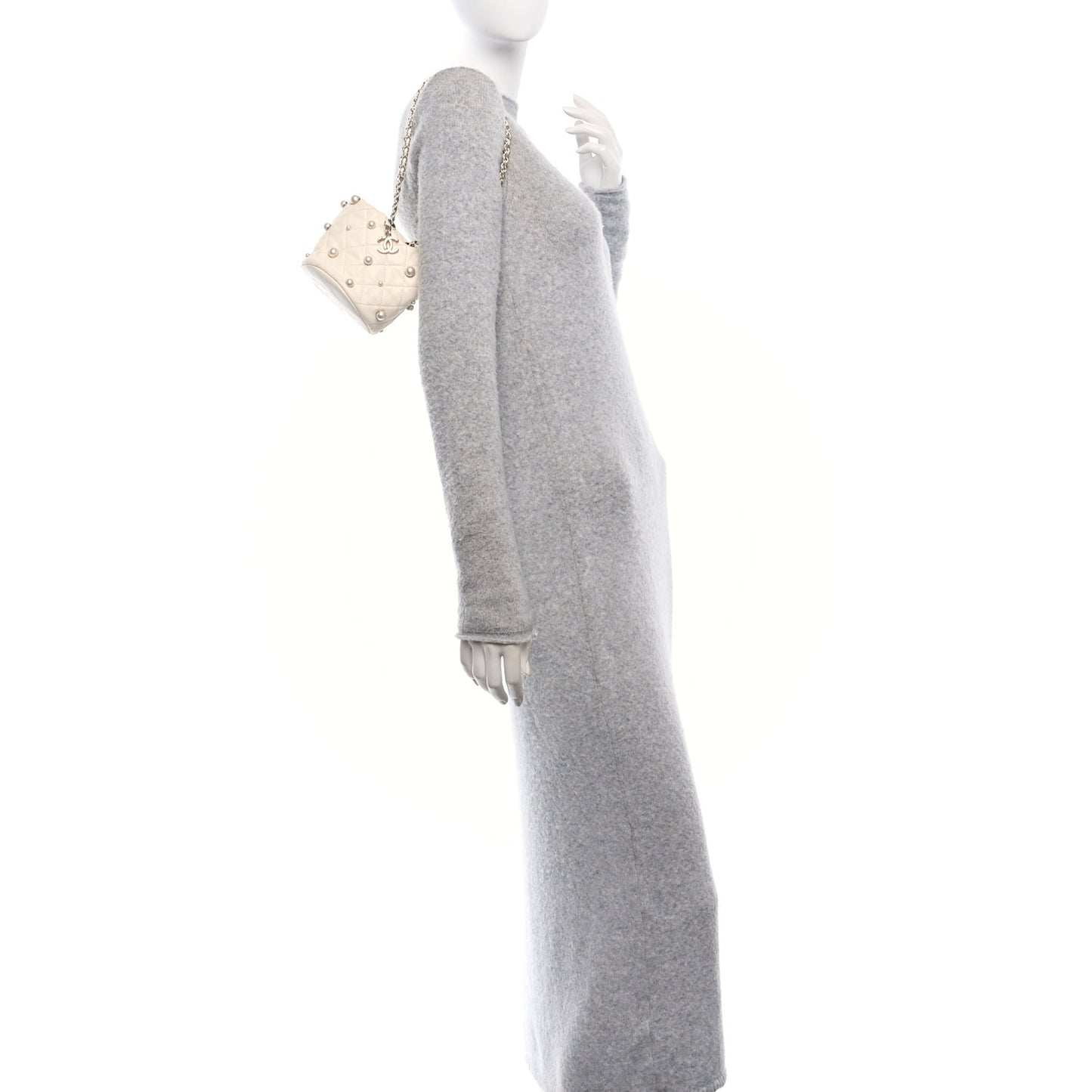 This is an authentic CHANEL Lambskin Quilted Pearl Mini About Pearls Drawstring Bag in White. This quilted bucket bag features a leather threaded drawstring strap. The top opens to a small fabric bucket-shaped interior, lined in grosgrain fabric.Follow this item for alerts. Chanel is a registered trademark of Chanel. FASHIONPHILE is not affiliated with Chanel.