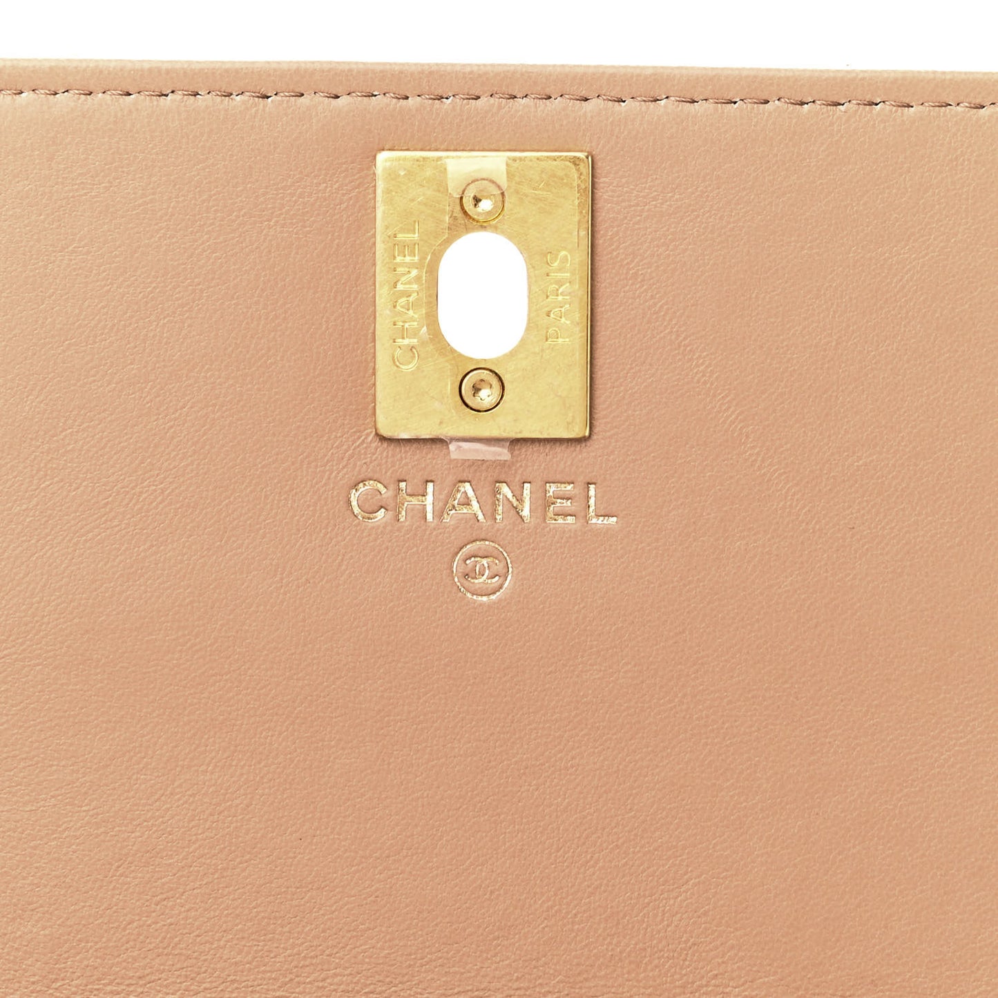 This is an authentic CHANEL Lambskin Quilted Pillow Crush Wallet On Chain WOC in Dark Beige. This stylish shoulder bag is crafted of diamond quilted lambskin leather in beige. It features an adjustable leather threaded gold chain shoulder strap and a flap with an aged gold CC strap adjuster. The flap opens to a matching leather and fabric interior with card slots, a flat pocket, and a zip compartment.