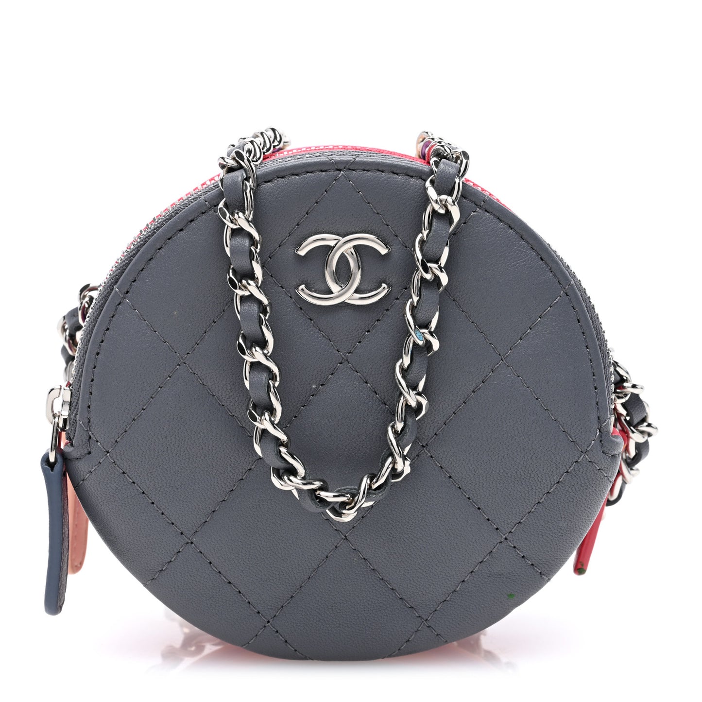 This is an authentic CHANEL Lambskin Quilted Round Clutch With Chain in Multicolor. This stylish crossbody bag is crafted of luxurious diamond-quilted lambskin leather. The bag features a leather-threaded polished silver chain-link shoulder strap and a matching Chanel CC logo on the front. The wrap-around zipper opens the bag to a gray fabric interior.Follow this item for alerts. Chanel is a registered trademark of Chanel. FASHIONPHILE is not affiliated with Chanel.