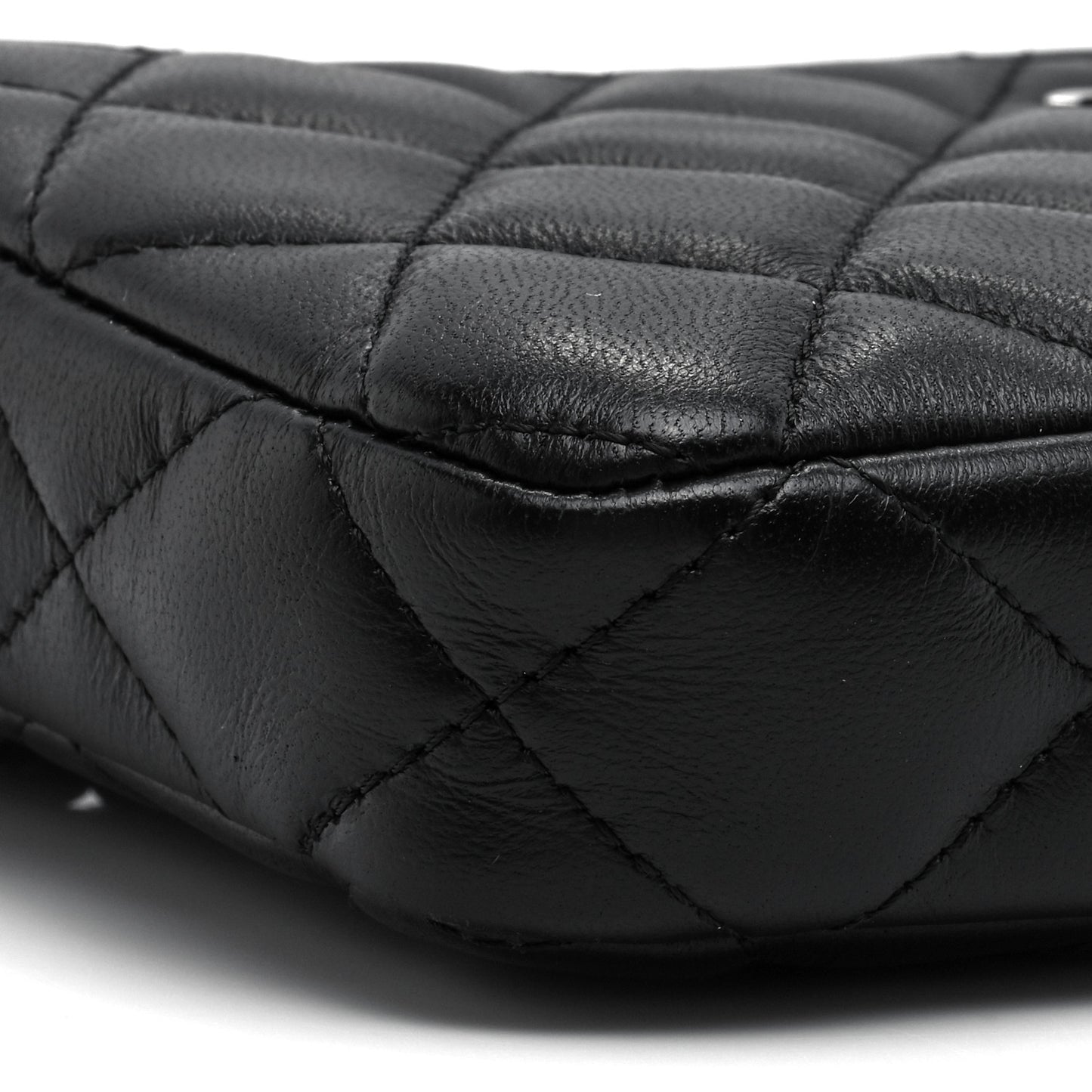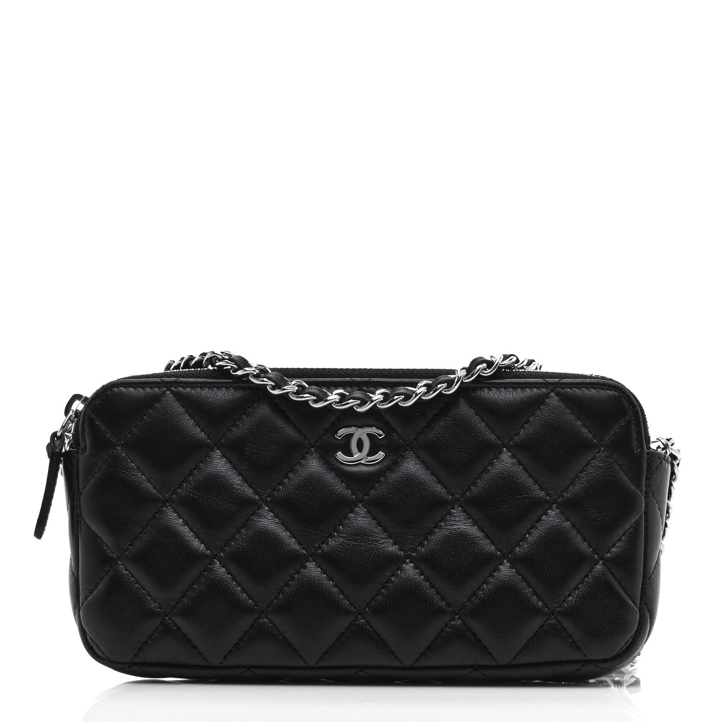 This is an authentic CHANEL Lambskin Quilted Small Clutch With Chain in Black. This stylish wallet is crafted of textured diamond quilted lambskin leather in black. The bag features a black leather threaded silver chain-link crossbody strap and a silver Chanel CC logo. This bag has two top zippers that open to a burgundy fabric interior with card slot panels.Follow this item for alerts. Chanel is a registered trademark of Chanel. FASHIONPHILE is not affiliated with Chanel.