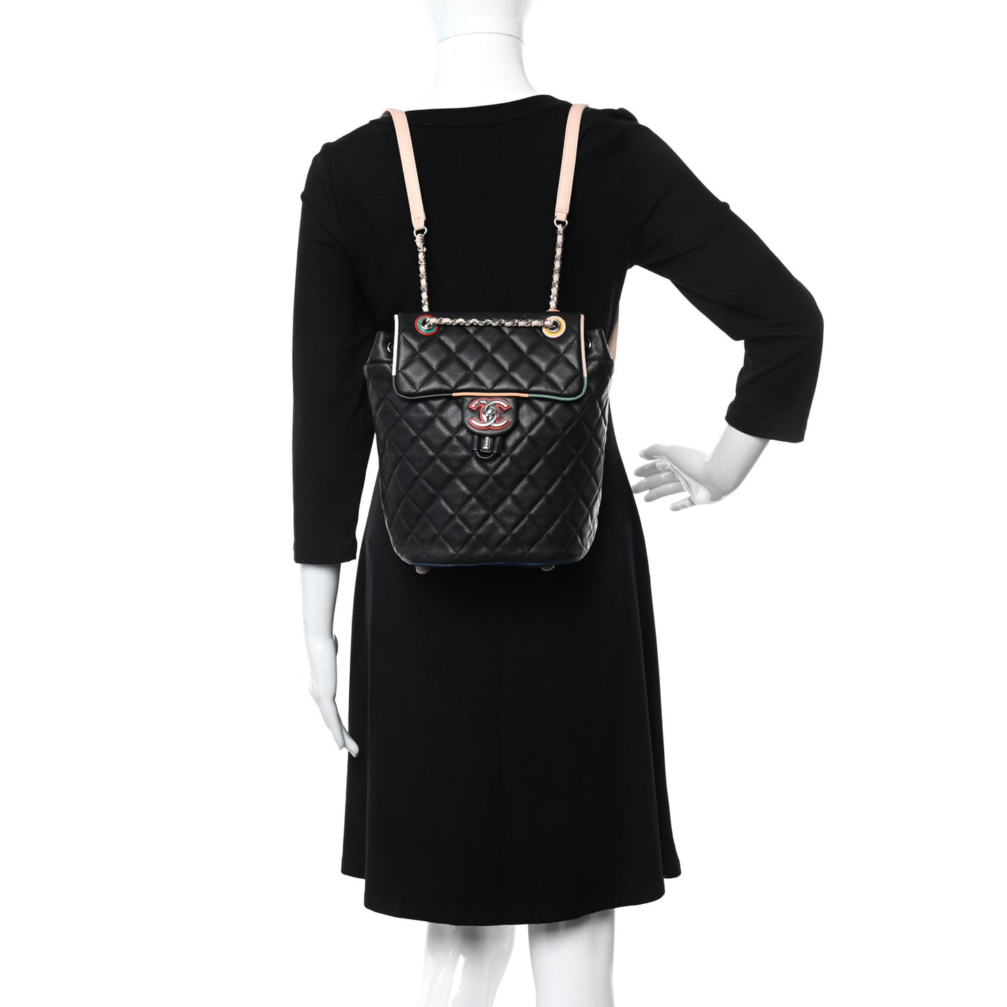 This is an authentic CHANEL Lambskin Quilted Small Cuba Urban Spirit Backpack in Black. This festive backpack is beautifully crafted of soft and smooth diamond-quilted lambskin leather in multicolor on black. It features polished silver chain link pink leather threaded shoulder straps, an orange back, a facing external flap with multicolor edges with a silver tone Chanel CC turn lock. This opens to a spacious drawstring black fabric interior with a zippered pocket.Follow this item for alerts. Chanel is a registered trademark of Chanel. FASHIONPHILE is not affiliated with Chanel.
