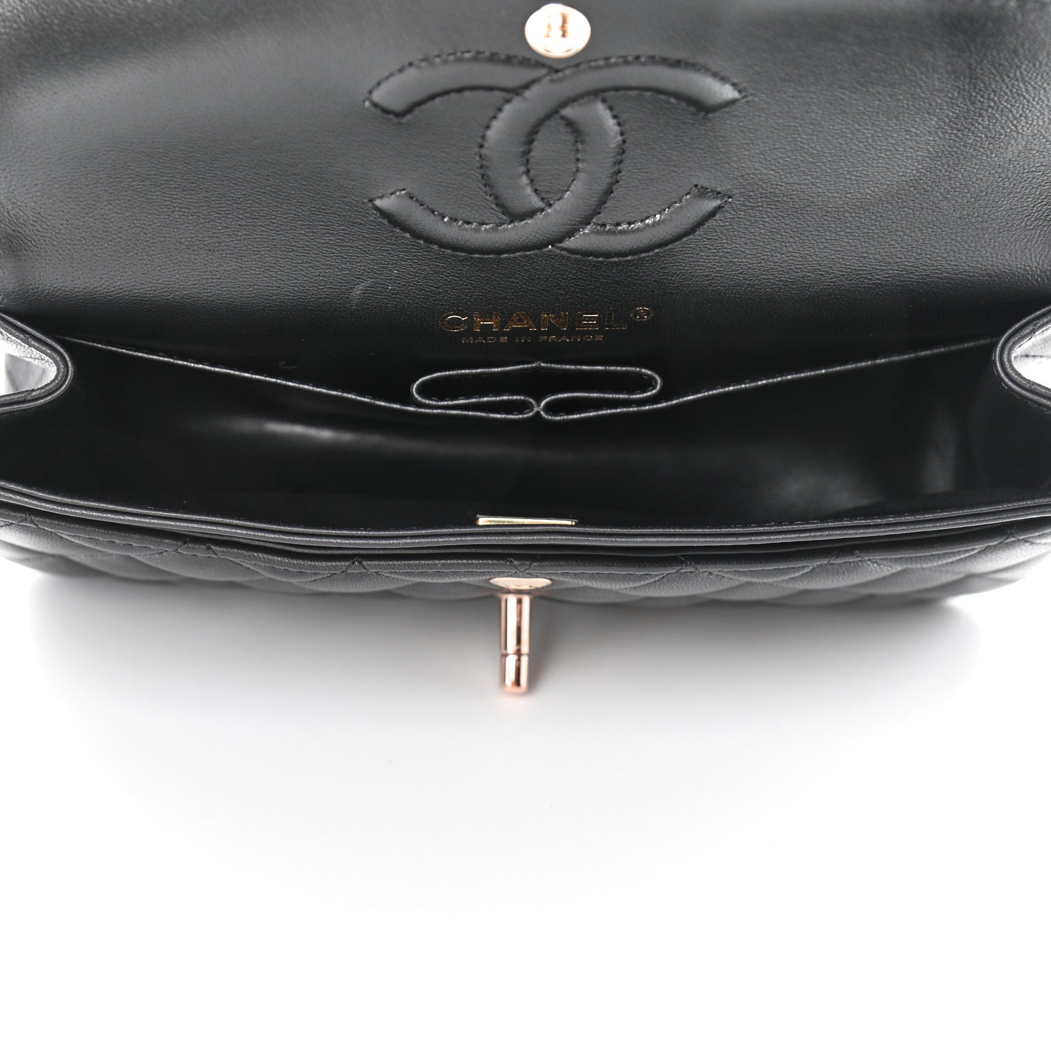 This is an authentic CHANEL Lambskin Quilted Small Double Flap Black. This stunning shoulder bag is crafted of diamond quilted lambskin leather in black. The bag features a rose gold chain-link shoulder strap threaded with leather and a matching rose gold Chanel CC turn-lock for the facing flap. This opens to reveal an inner flap and a black leather interior with patch pockets.Follow this item for alerts. Chanel is a registered trademark of Chanel. FASHIONPHILE is not affiliated with Chanel.