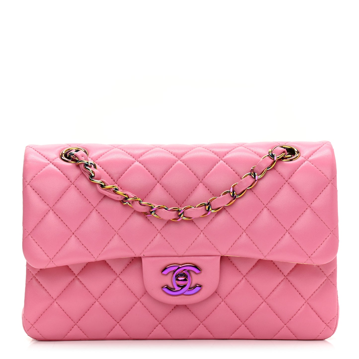 This is an authentic CHANEL Lambskin Quilted Small Double Flap in Pink and Yellow. This stunning small shoulder bag is finely crafted of diamond quilted luxurious caviar leather in pink. The bag features a long rainbow chain link shoulder strap threaded with leather and a frontal flap with a rainbow Chanel Classic CC turn lock. This opens to a yellow leather interior with patch pockets.Follow this item for alerts. Chanel is a registered trademark of Chanel. FASHIONPHILE is not affiliated with Chanel.
