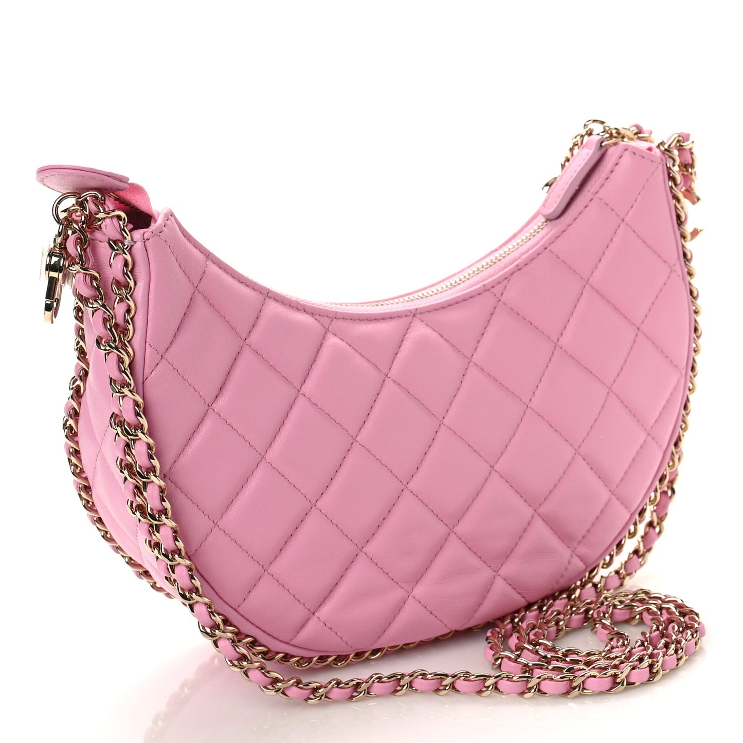 This is an authentic CHANEL Lambskin Quilted Small Hobo Bag in Pink. This chic shoulder bag is crafted of diamond-quilted lambskin leather in pink. The bag features a lambskin threaded light gold chain strap lining the edges of the bag with light gold Chanel CC charms. The top unzips to a pink fabric interior.Follow this item for alerts. Chanel is a registered trademark of Chanel. FASHIONPHILE is not affiliated with Chanel.