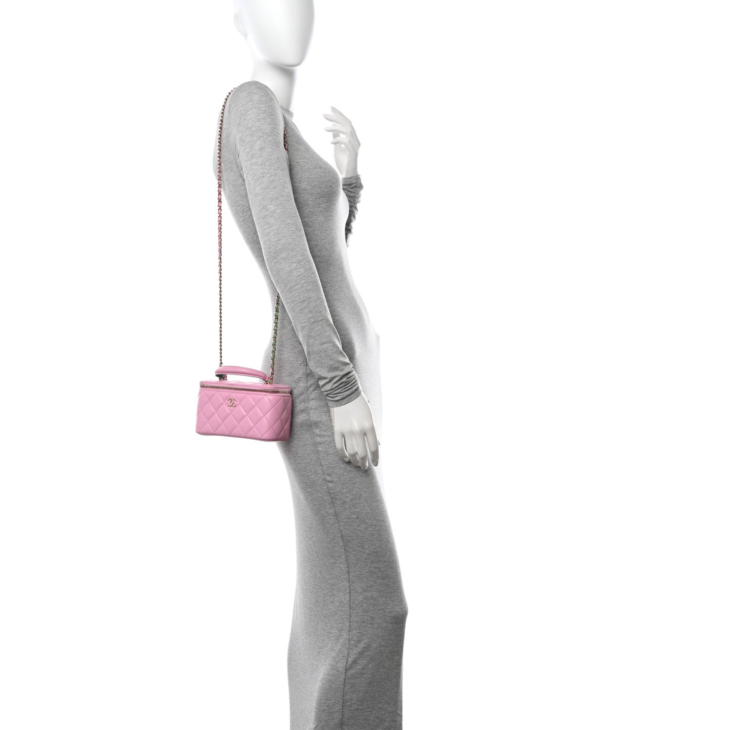 This is an authentic CHANEL Lambskin Quilted Small Top Handle Vanity Case With Chain in Lilac and Light Green. This stylish crossbody is crafted of supple lambskin leather in light pink. The bag features a leather threaded gold chain-link shoulder strap and gold hardware. The handbag features a 3/4 wrap-around zipper that opens to a light green leather interior.Follow this item for alerts. Chanel is a registered trademark of Chanel. FASHIONPHILE is not affiliated with Chanel.