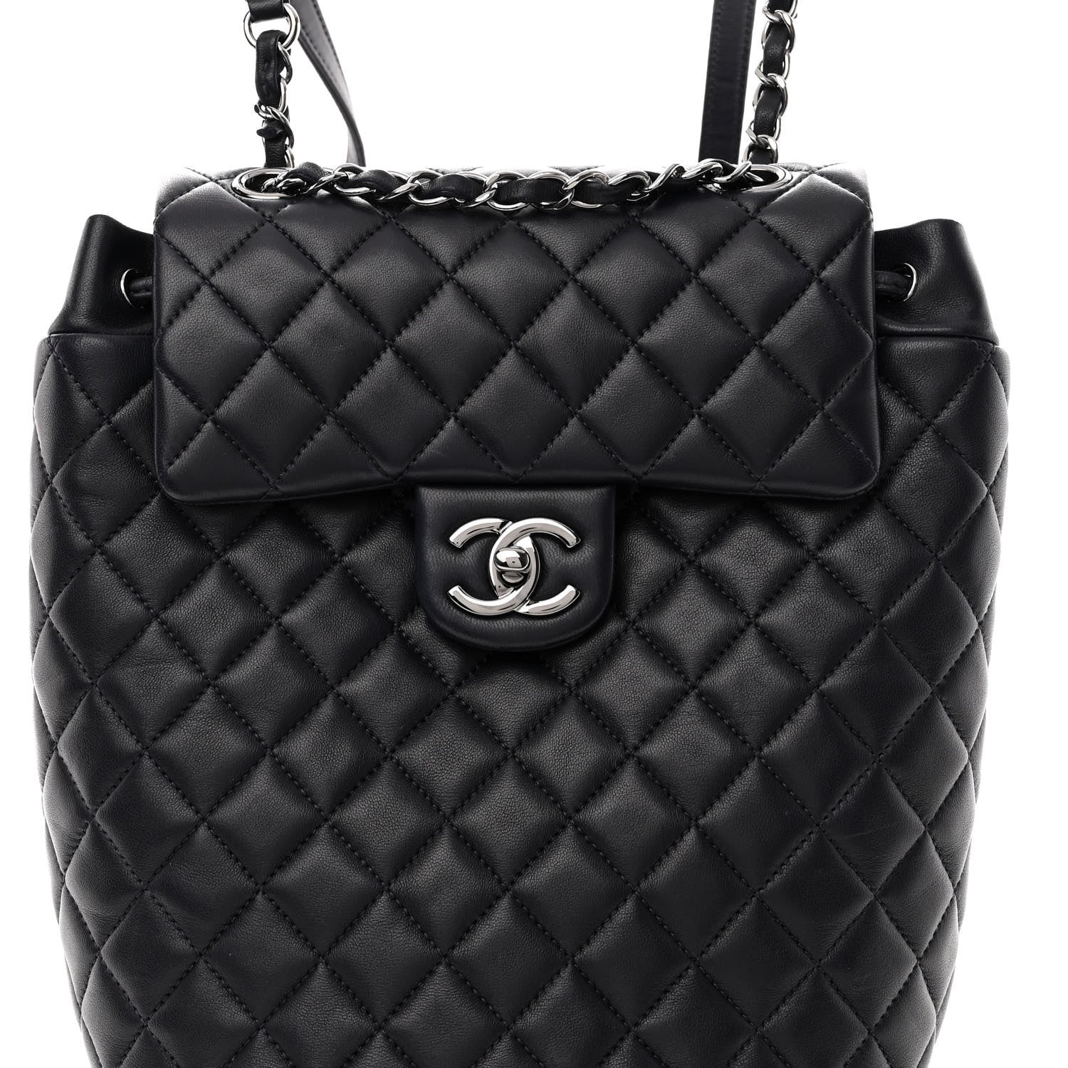 This is an authentic CHANEL Lambskin Quilted Small Urban Spirit Backpack in Navy. This stylish backpack is beautifully crafted of soft and smooth diamond-quilted lambskin leather in dark Navy. It features silver chain link leather threaded shoulder straps, an exterior rear patch pocket, a facing external flap that opens with a silver Chanel CC turn lock and an open-top that closes with a cinch cord. The front flap opens to a fabric interior with zipper and patch pockets.Follow this item for alerts. Chanel is a registered trademark of Chanel. FASHIONPHILE is not affiliated with Chanel.