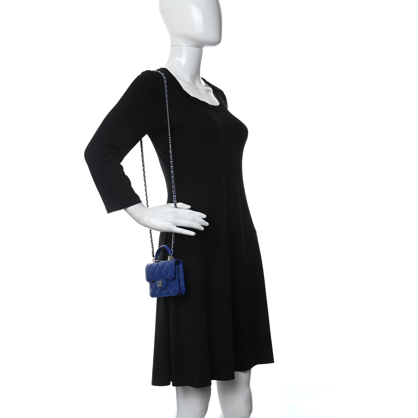 This is an authentic CHANEL Lambskin Quilted Top Handle Flap Coin Purse With Chain in Blue. This stylish bag is crafted of luxuriously soft diamond quilted calfskin leather in royal blue. The bag features a chain shoulder strap and a facing flap with a small gold Chanel CC logo. The flap opens to a matching fabric interior.Follow this item for alerts. Chanel is a registered trademark of Chanel. FASHIONPHILE is not affiliated with Chanel.