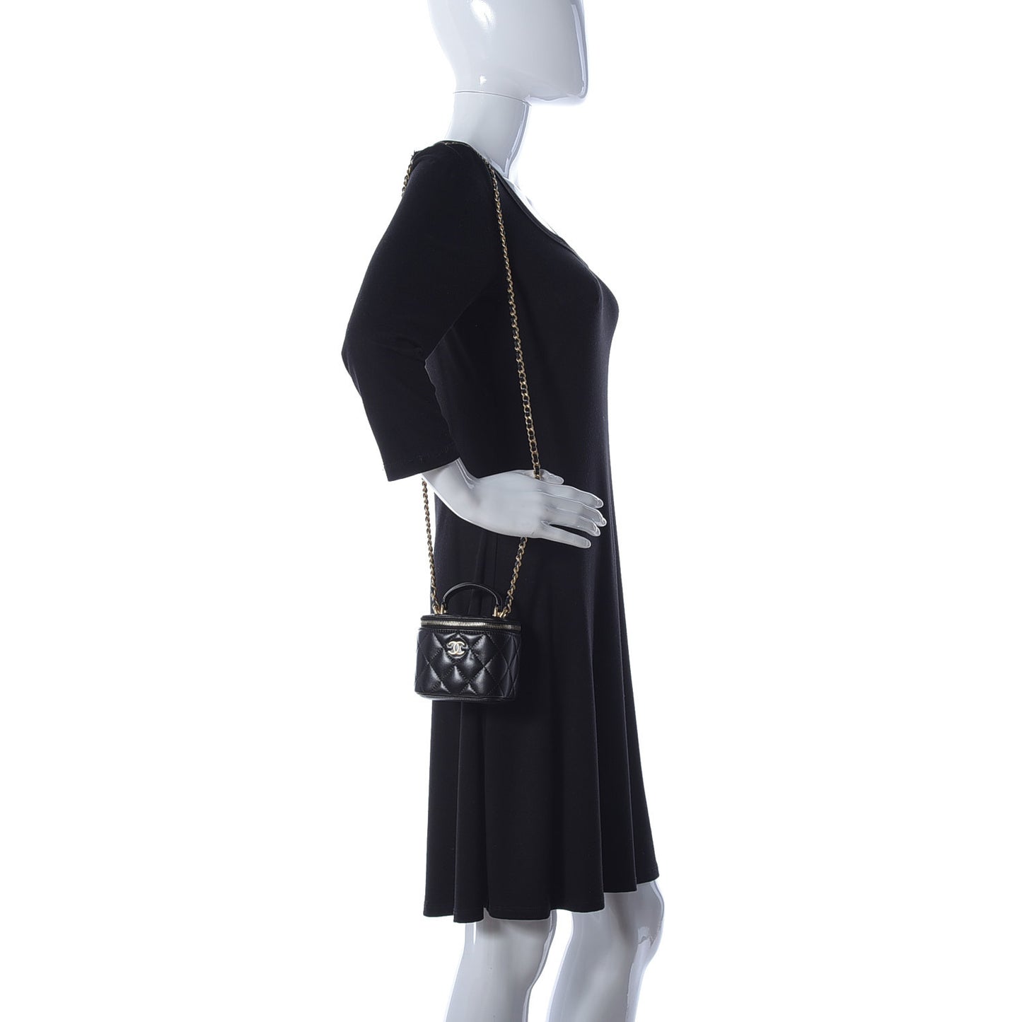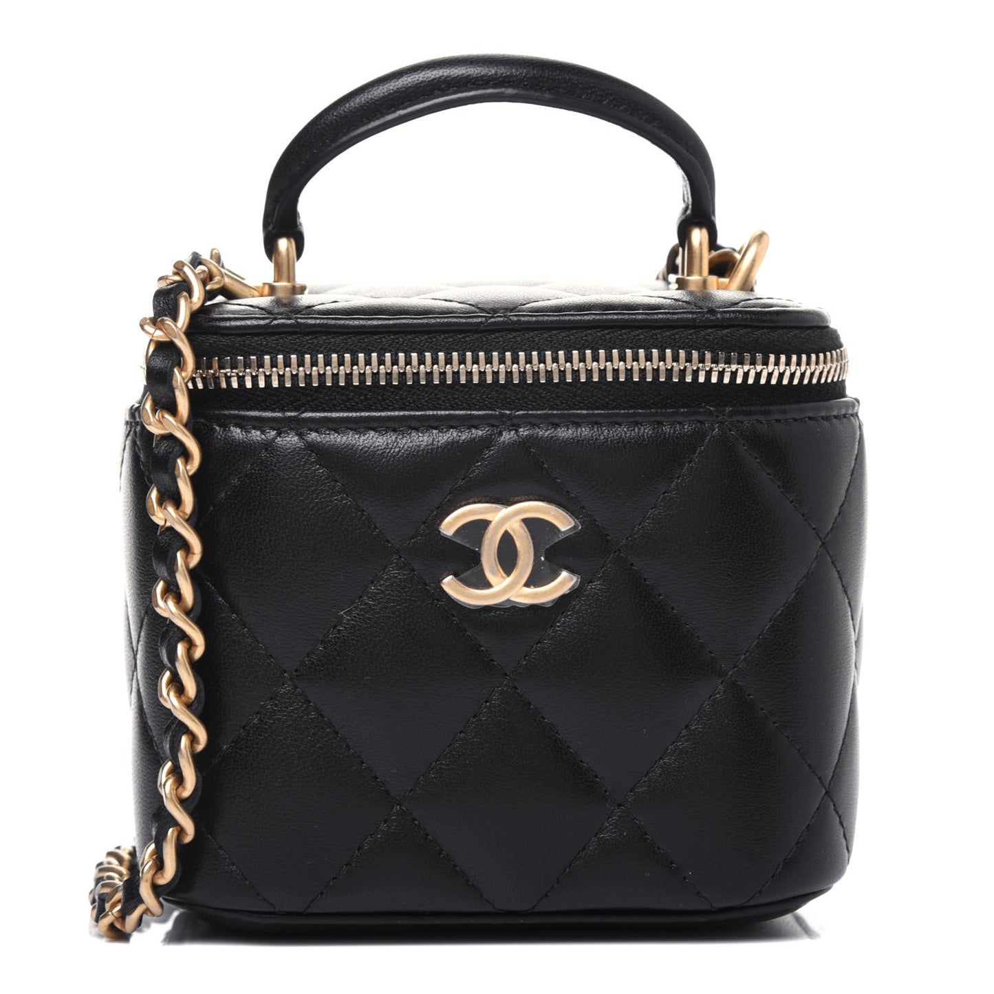 This is an authentic CHANEL Lambskin Quilted Top Handle Mini Vanity Case With Chain in Black. This stylish crossbody is crafted of luxurious lambskin leather in black. The bag features a leather top handle, leather threaded gold chain-link shoulder strap, and gold hardware. The handbag features a 3/4 wrap-around zipper that opens to a black fabric interior.Follow this item for alerts. Chanel is a registered trademark of Chanel. FASHIONPHILE is not affiliated with Chanel.