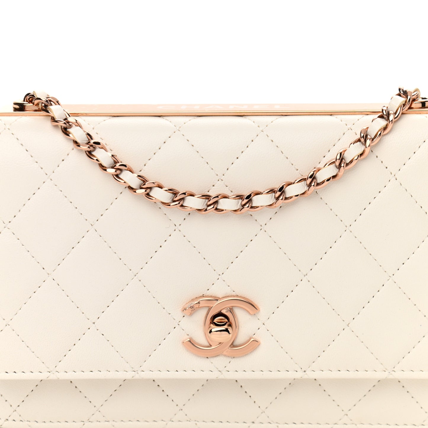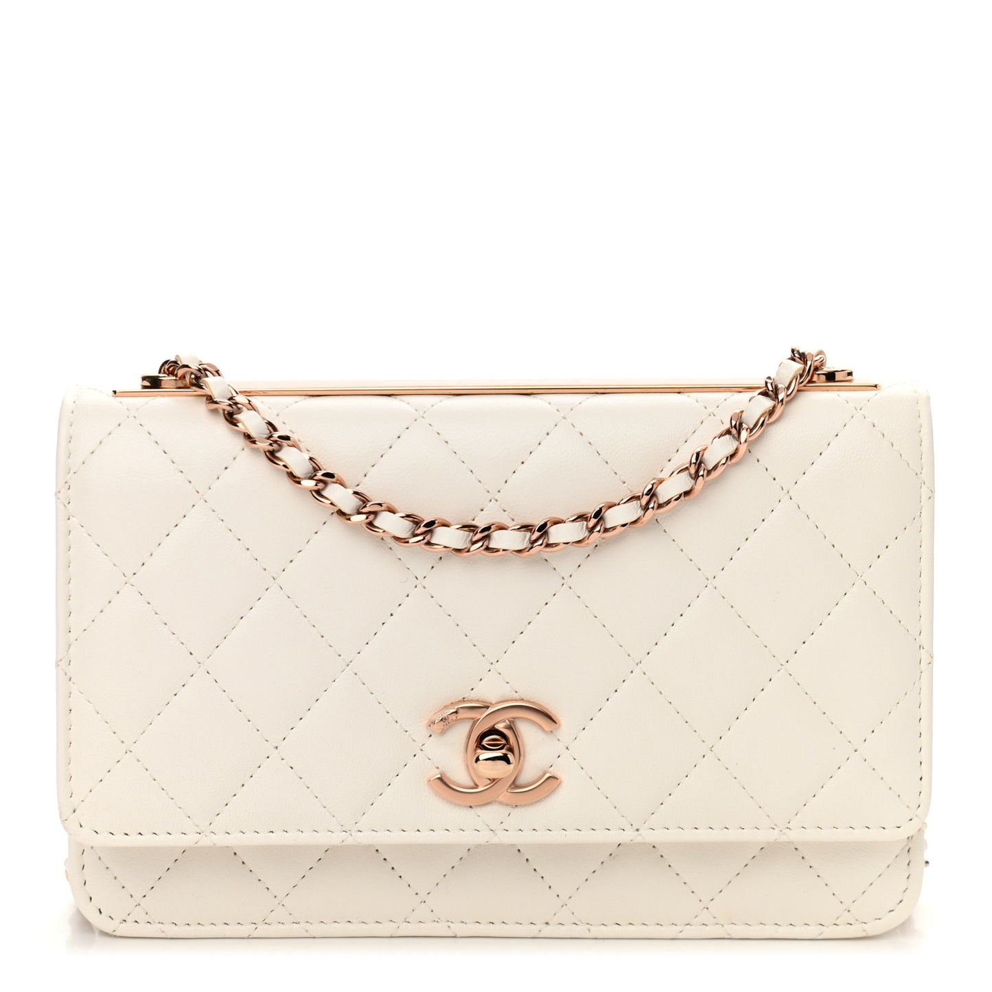 This is an authentic CHANEL Lambskin Quilted Trendy CC Wallet On Chain WOC in White. This wallet is crafted of luxuriously soft diamond quilted lambskin leather in white. It features a full rose gold metal hardware plate with the Chanel logo, a leather threaded rose gold chain-link shoulder strap, and a facing flap with a rose gold Chanel CC turn lock. The flap opens to a matching leather and fabric interior with card slots, patch pockets, and a zipper compartment.Follow this item for alerts. Chanel is a registered trademark of Chanel. FASHIONPHILE is not affiliated with Chanel.