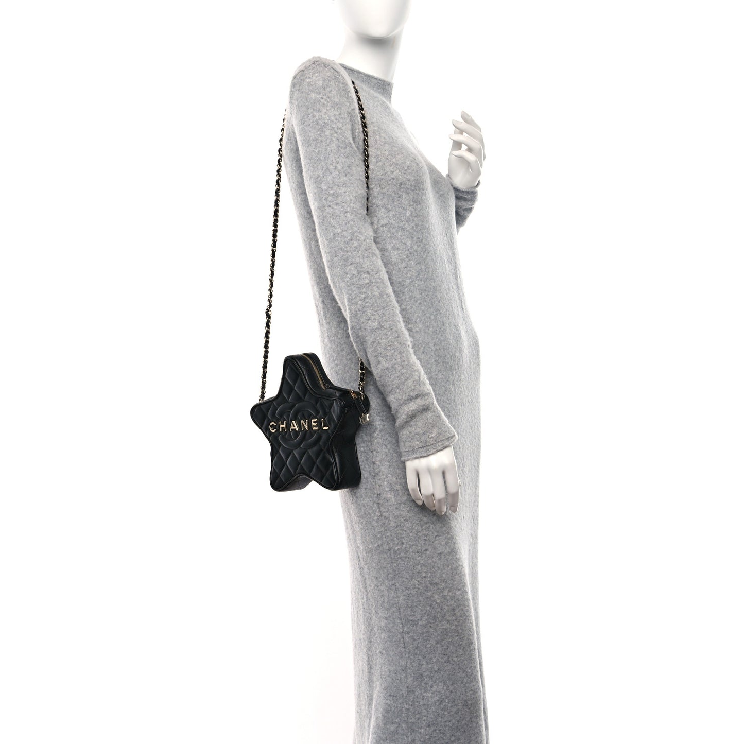 This is an authentic CHANEL Lambskin Quilted Walk of Fame Star Bag in Black. This stunning shoulder bag is crafted of diamond-quilted lambskin leather in black, in the shape of a star. The bag features a leather-threaded light gold chain shoulder strap, a quilted CC logo, and gold letters that spell the Chanel signature on the front. The top zipper opens to a black fabric interior with leather patch pockets.