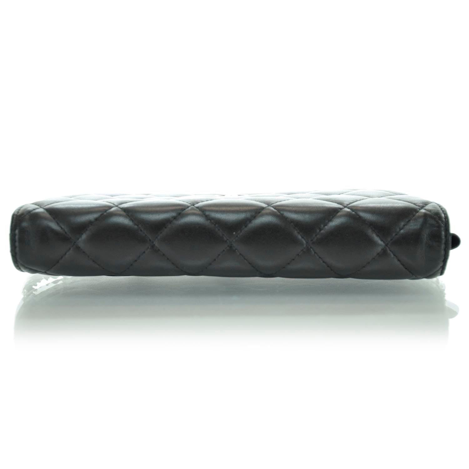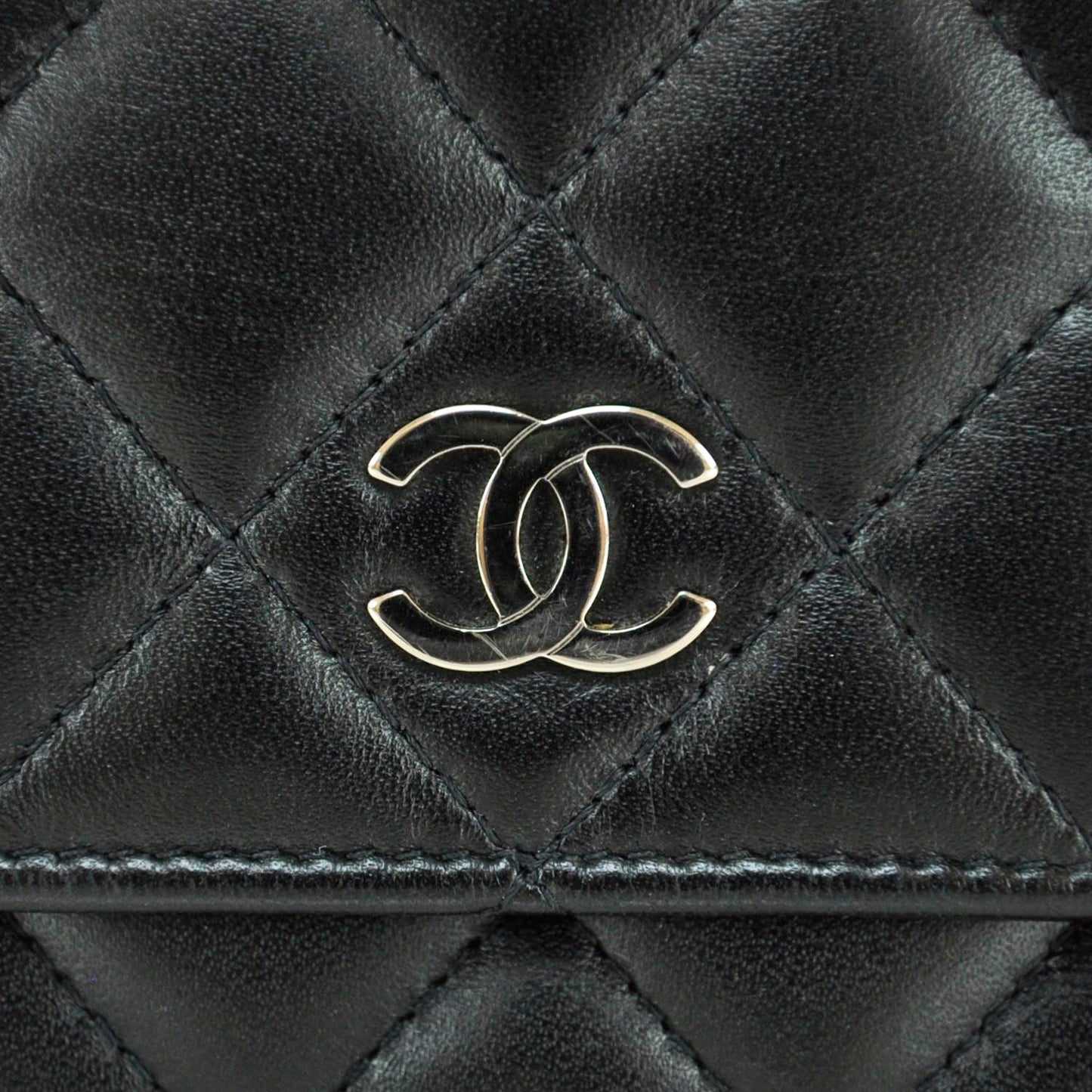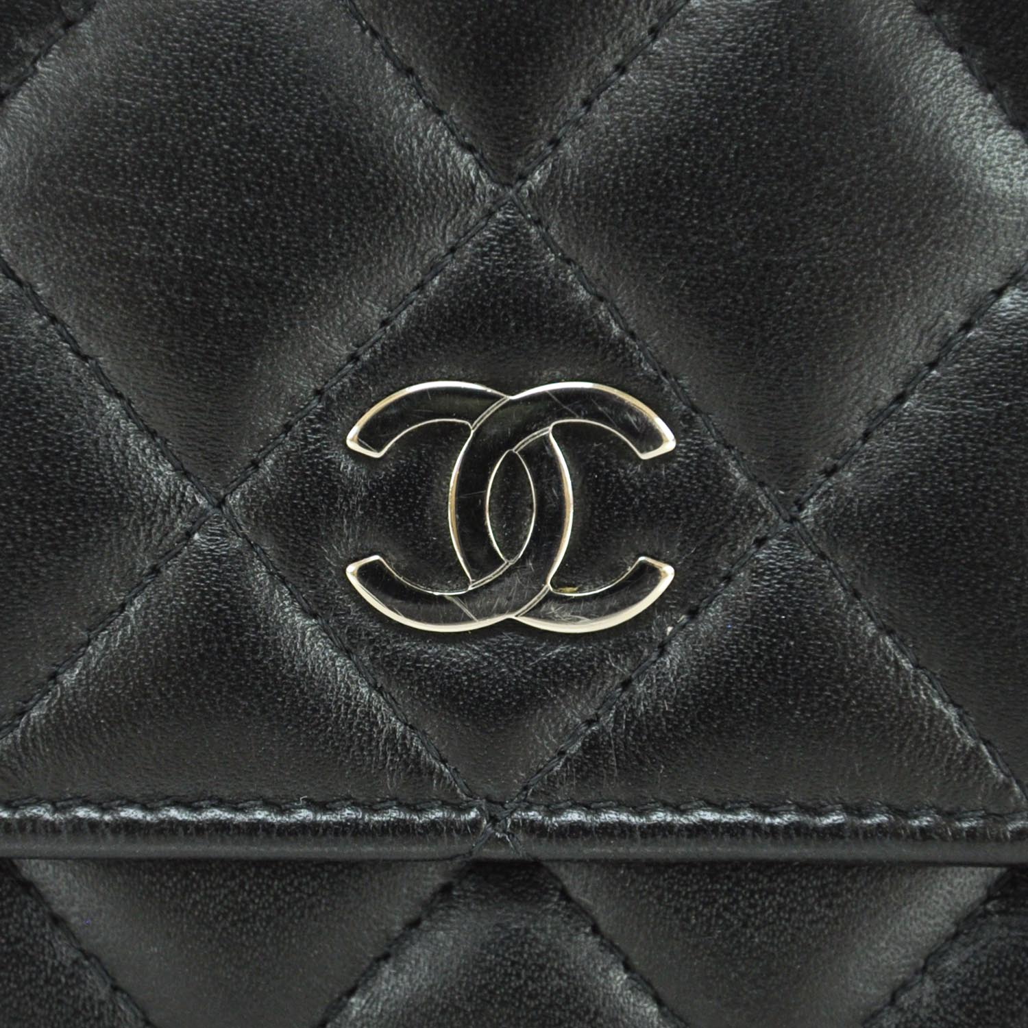 This is an authentic CHANEL Lambskin Quilted Wallet On Chain WOC in Black. This is a novel yet practical wallet by Chanel. It has all of the hallmarks of the Classic flap but in a smaller, clutch size. It comes in a black supple lambskin leather with a low quilt. The wallet has a medium flap and the back has a medium patch pocket. There is a CC snap closure. The wallet features a classic shoulder chain that is long enough for the wallet to be worn at your waist. The interior is leather with a large compartment, six card slots and bill slot. This is a stylish, novel wallet but it is also practical and you can carry currency and cards and also a few necessities safely at your side with a classic look.Follow this item for alerts. Chanel is a registered trademark of Chanel. FASHIONPHILE is not affiliated with Chanel.