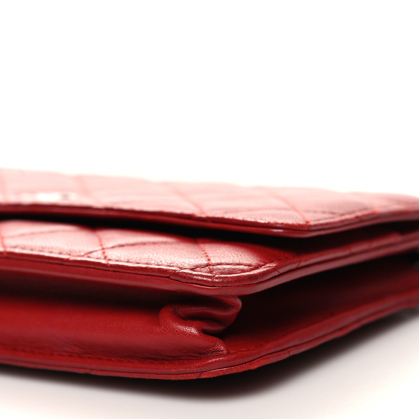 This is an authentic CHANEL Lambskin Quilted Wallet On Chain WOC in Red. This wallet on chain is crafted of luxuriously soft diamond-quilted lambskin leather in dark red. It features a silver chain-link leather threaded crossbody strap and a facing flap with a small silver Chanel CC logo. The flap opens to a matching fabric interior with card slots, patch pocket, and a zipper compartment.Follow this item for alerts. Chanel is a registered trademark of Chanel. FASHIONPHILE is not affiliated with Chanel.